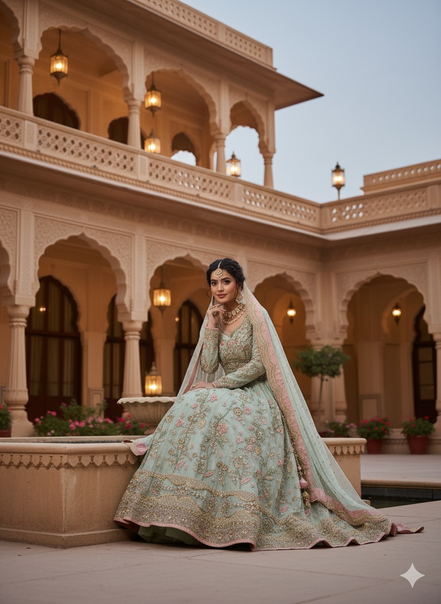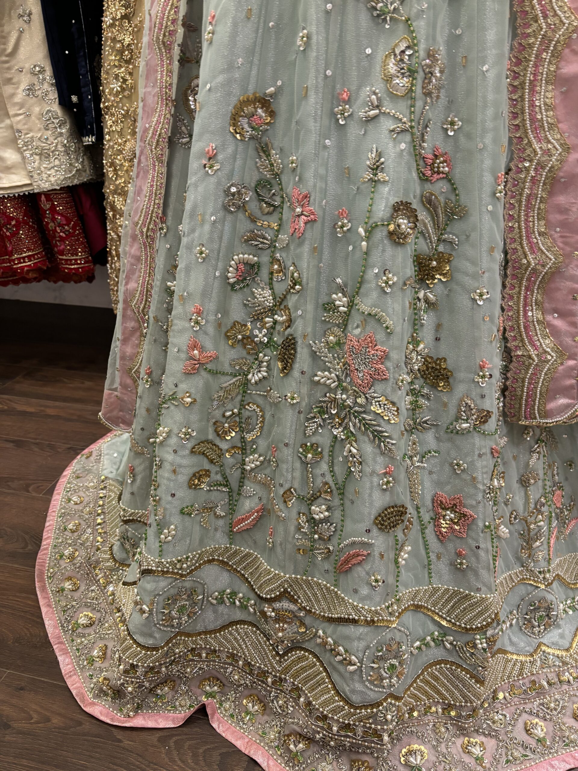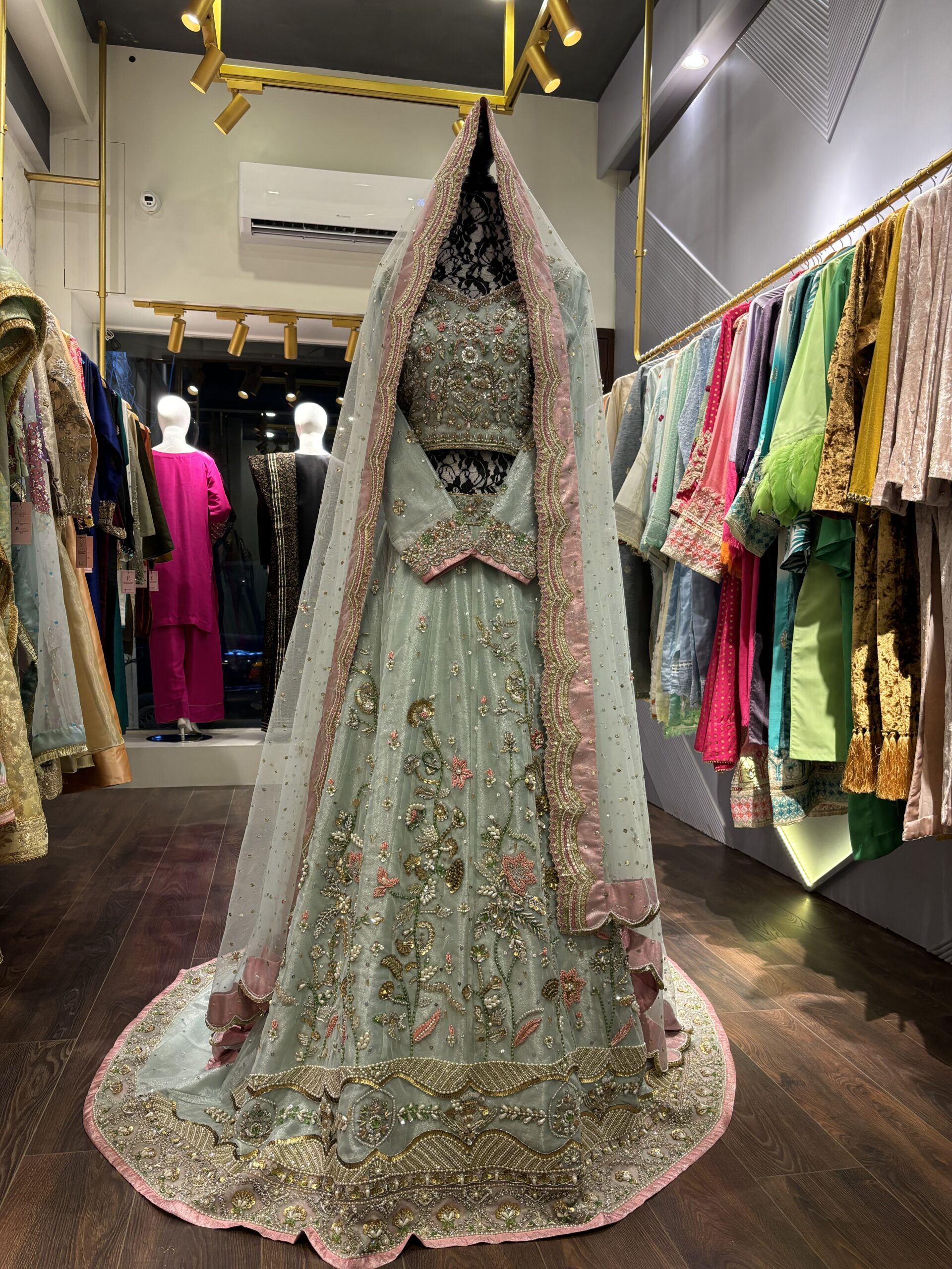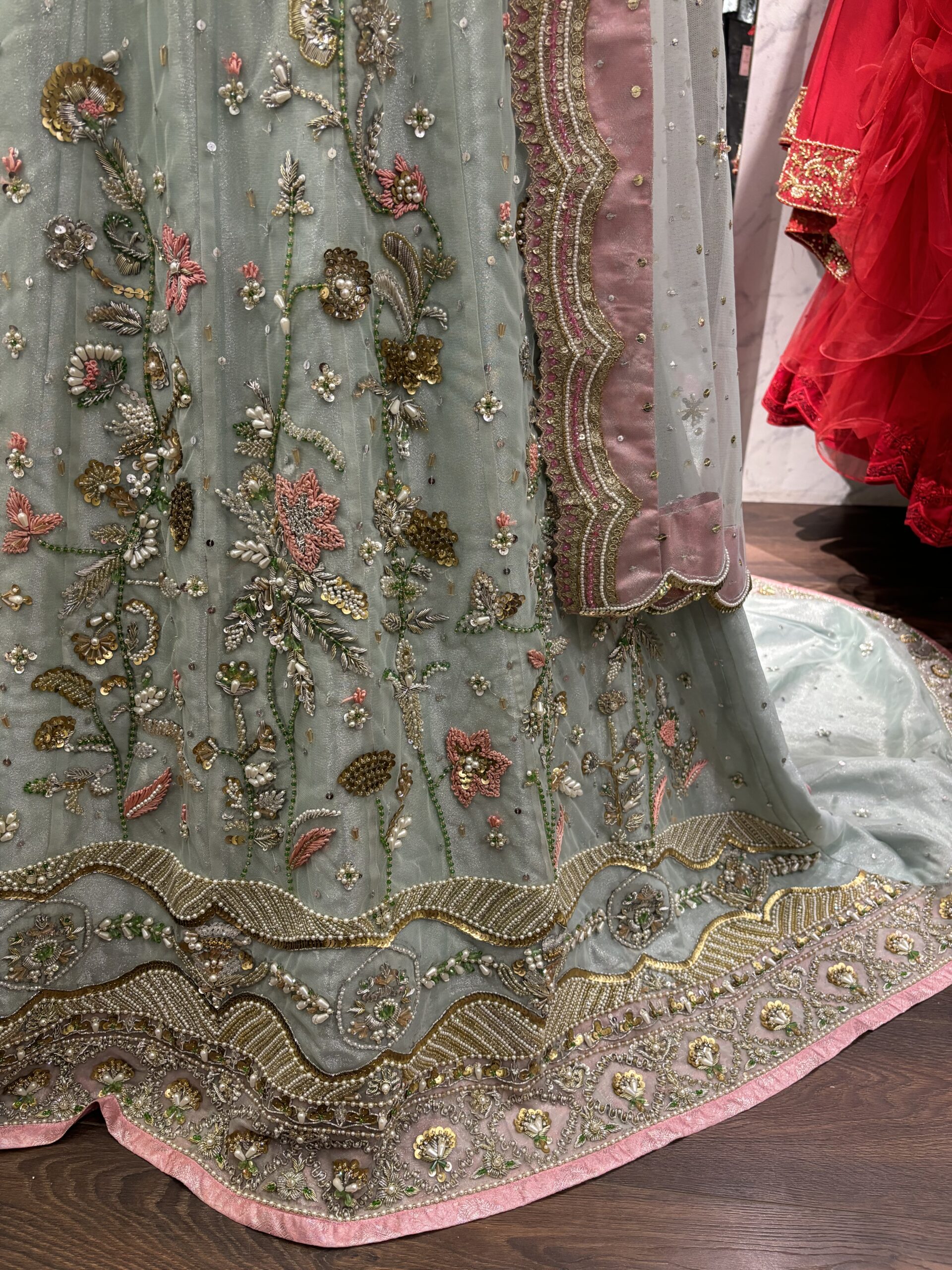 > The soft pastel hue is perfectly complemented by the rich, ornate borders and the flowing net dupatta, creating an unforgettable silhouette. This lehenga is a perfect blend of traditional grandeur and modern grace, making it an ideal choice for a wedding ceremony, reception, or grand celebration.