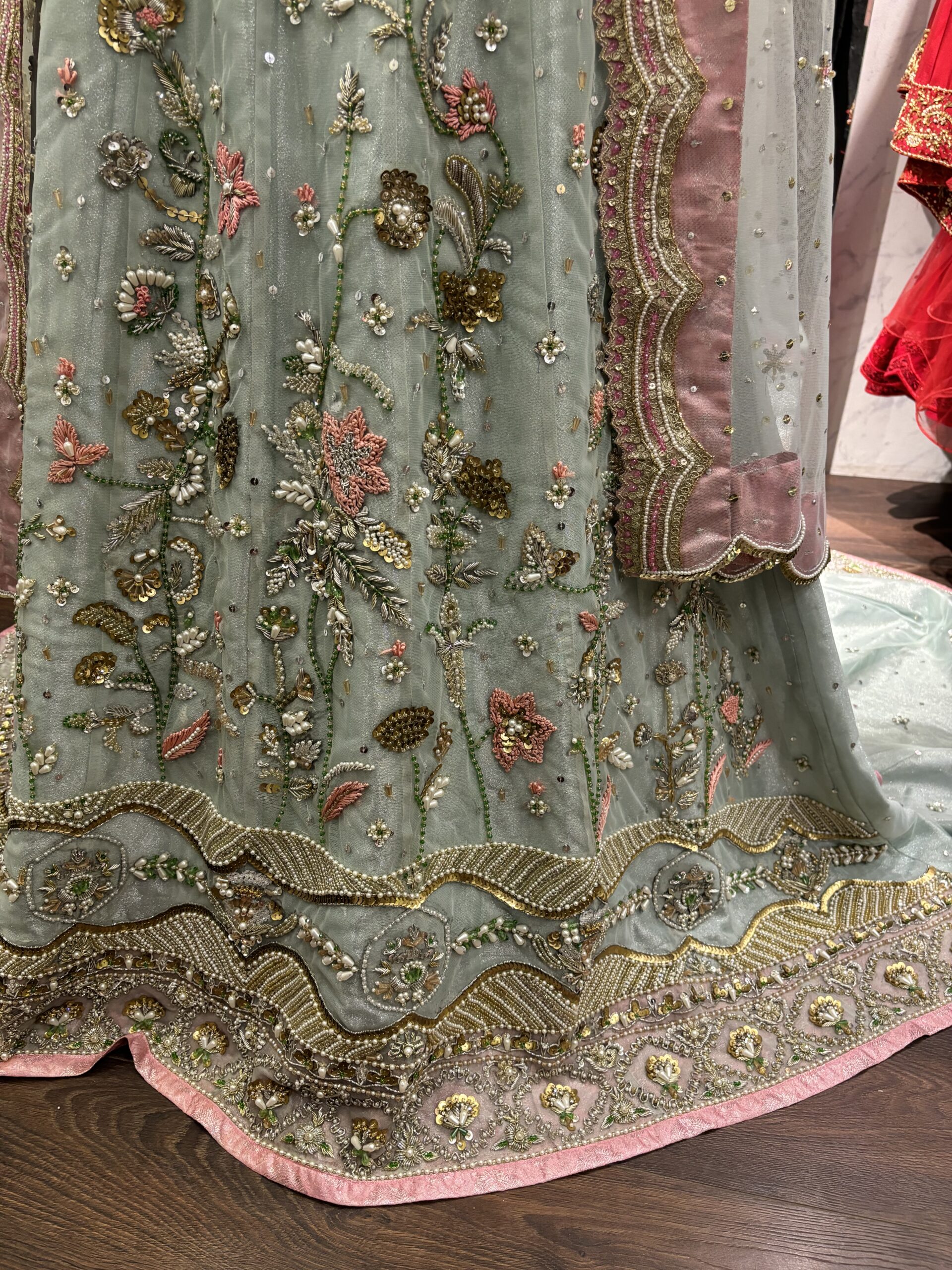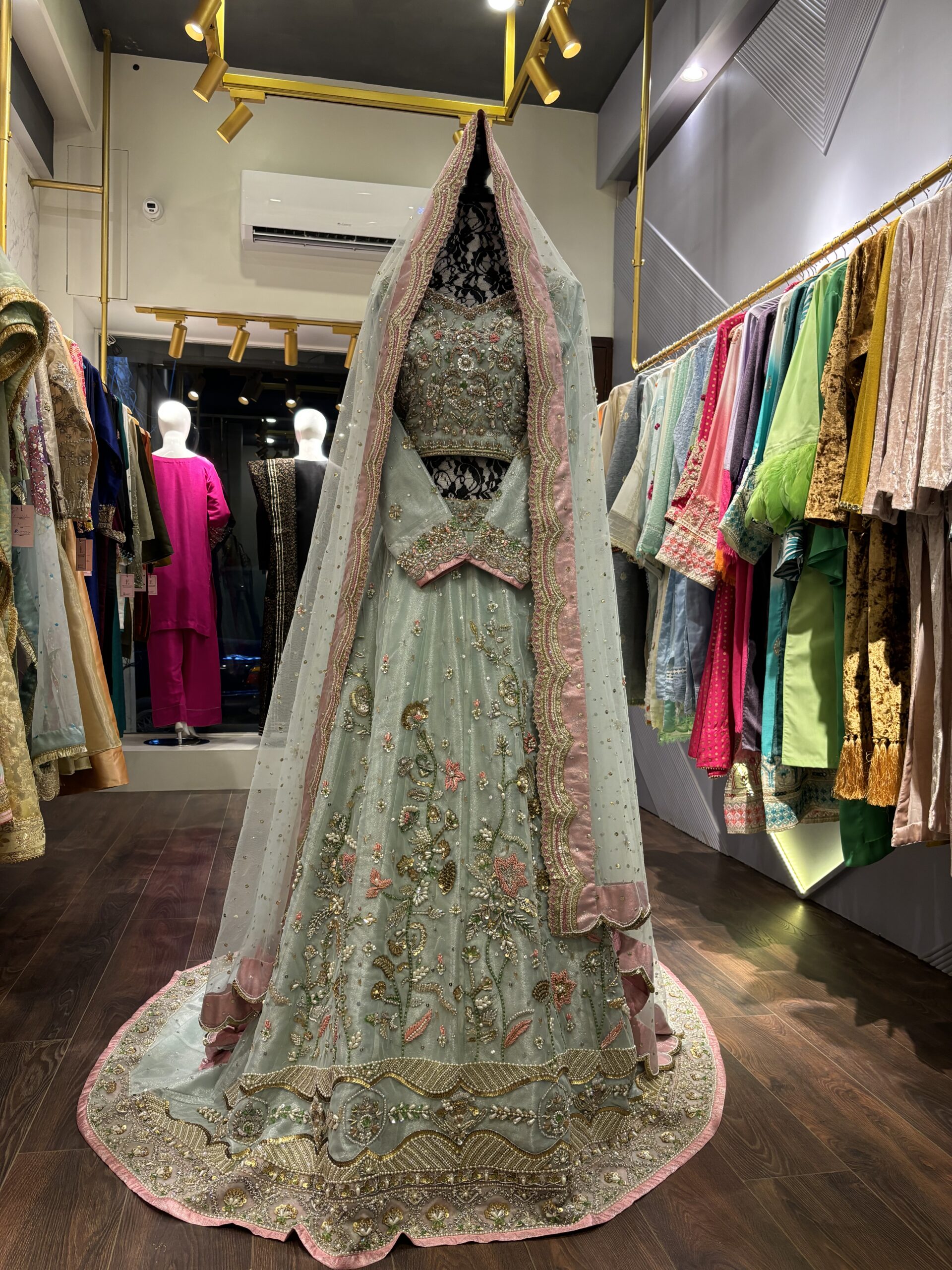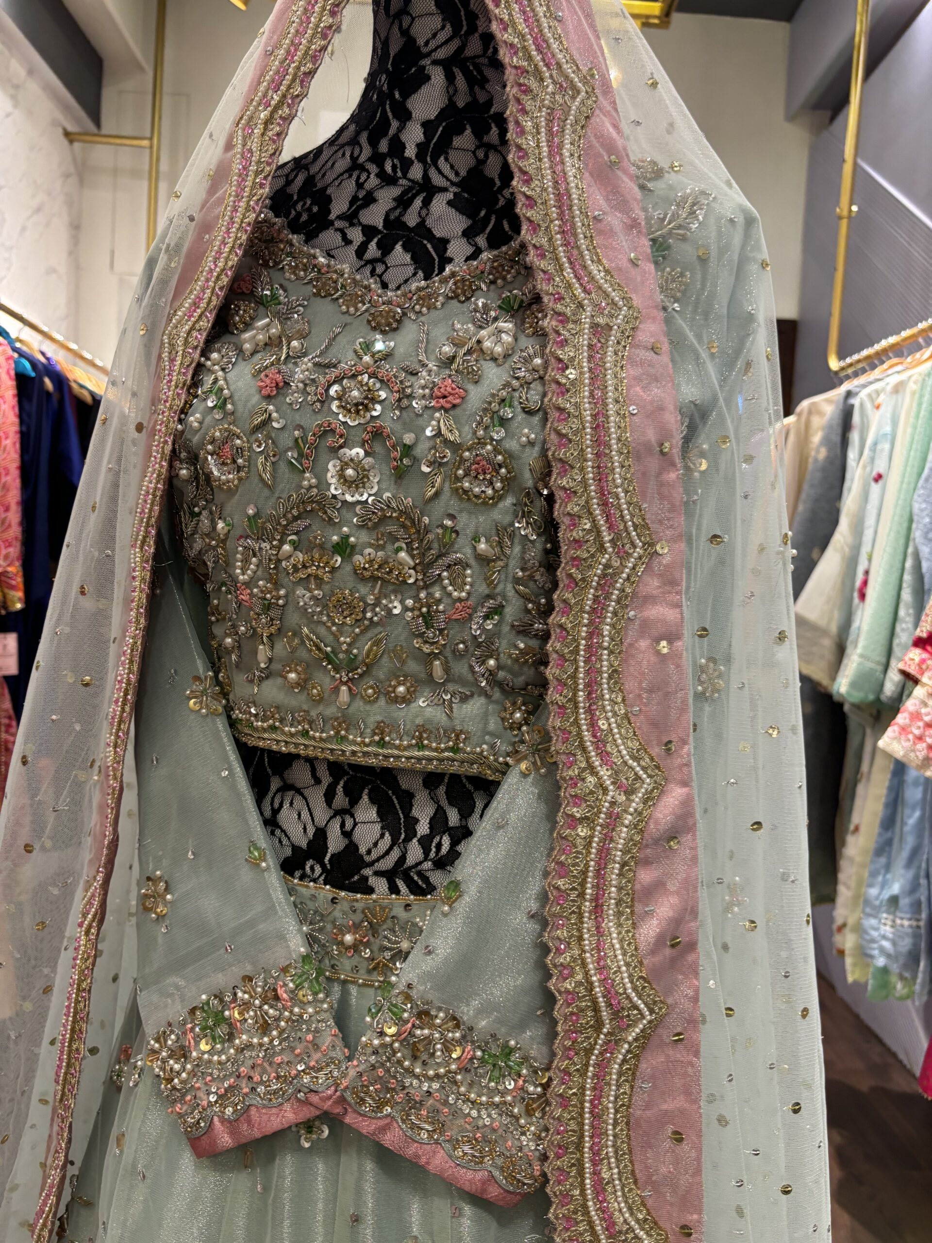 > The soft pastel hue is perfectly complemented by the rich, ornate borders and the flowing net dupatta, creating an unforgettable silhouette. This lehenga is a perfect blend of traditional grandeur and modern grace, making it an ideal choice for a wedding ceremony, reception, or grand celebration.