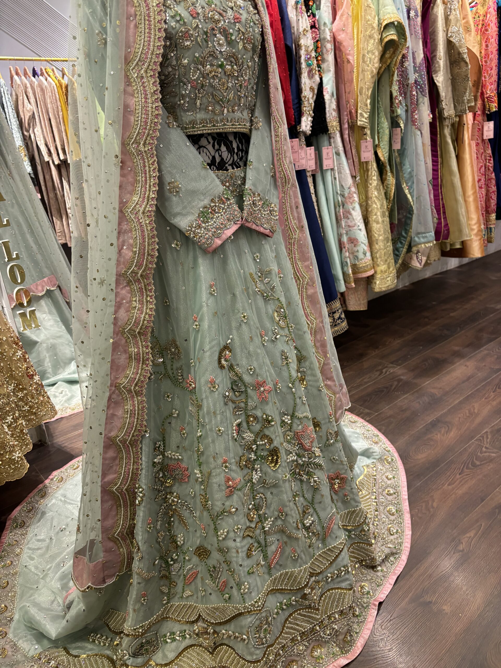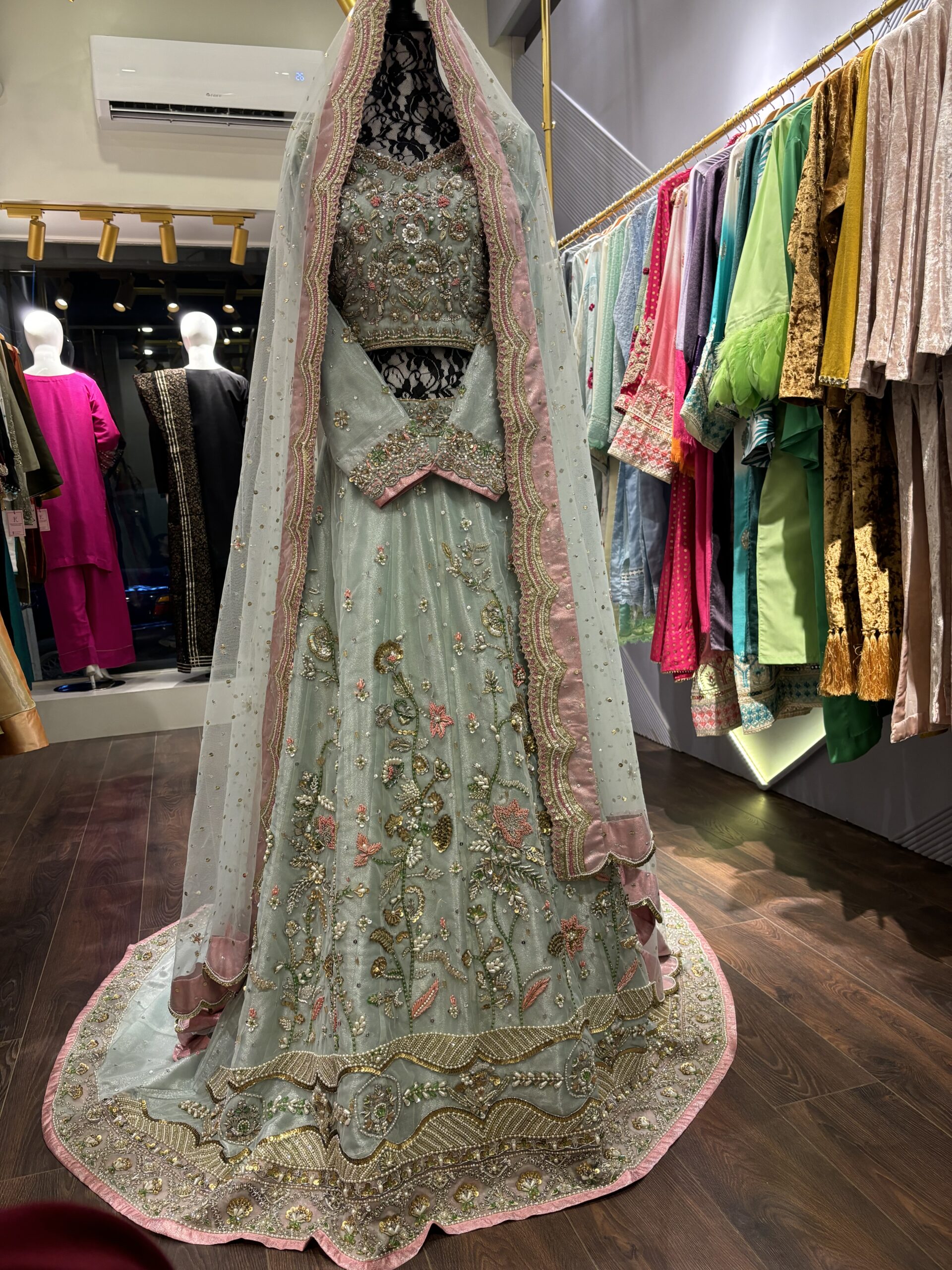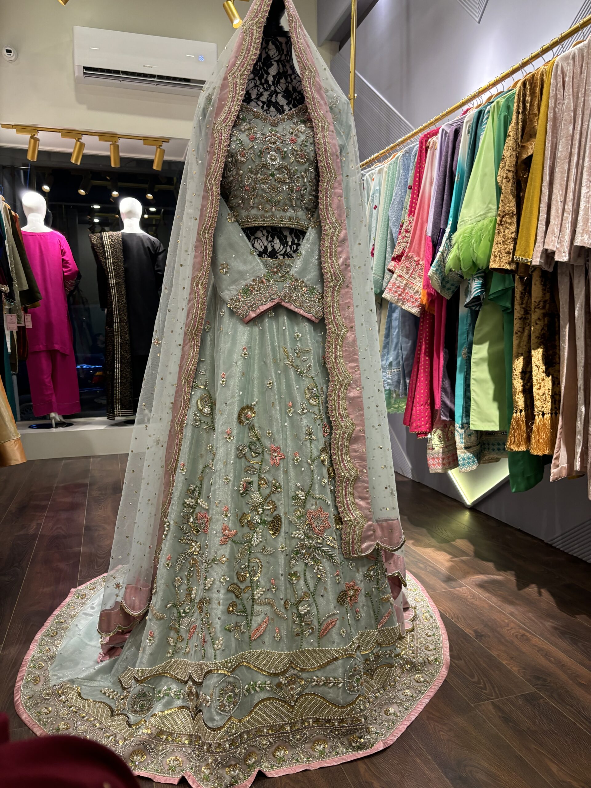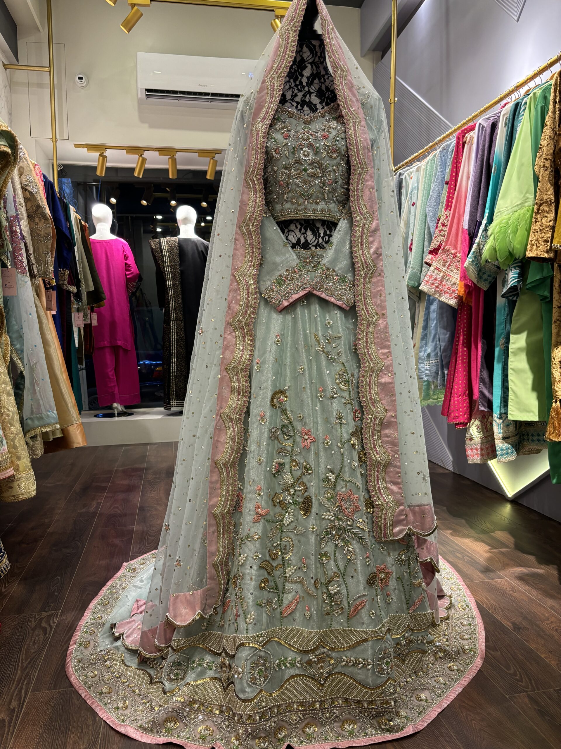 > The soft pastel hue is perfectly complemented by the rich, ornate borders and the flowing net dupatta, creating an unforgettable silhouette. This lehenga is a perfect blend of traditional grandeur and modern grace, making it an ideal choice for a wedding ceremony, reception, or grand celebration.