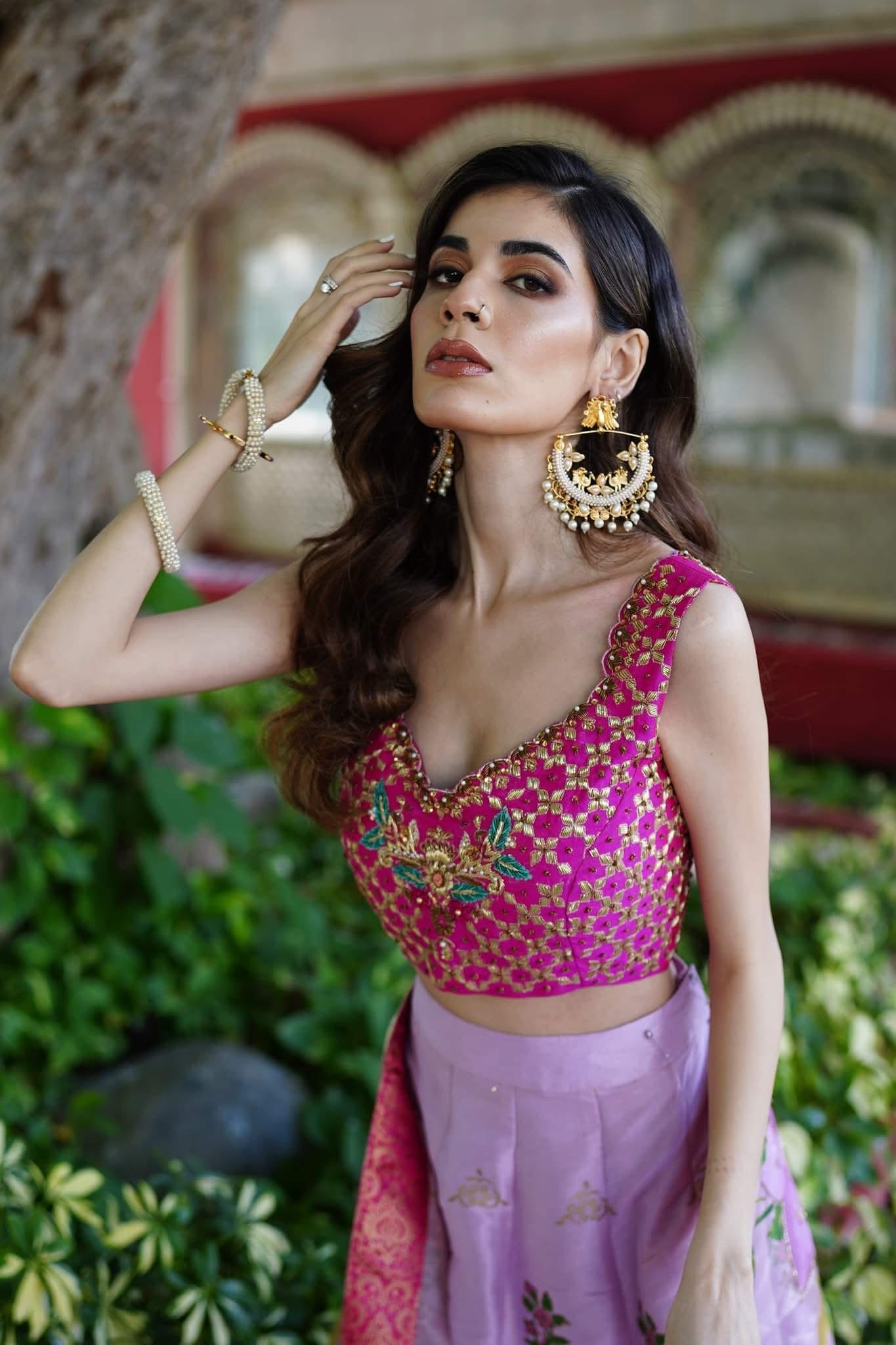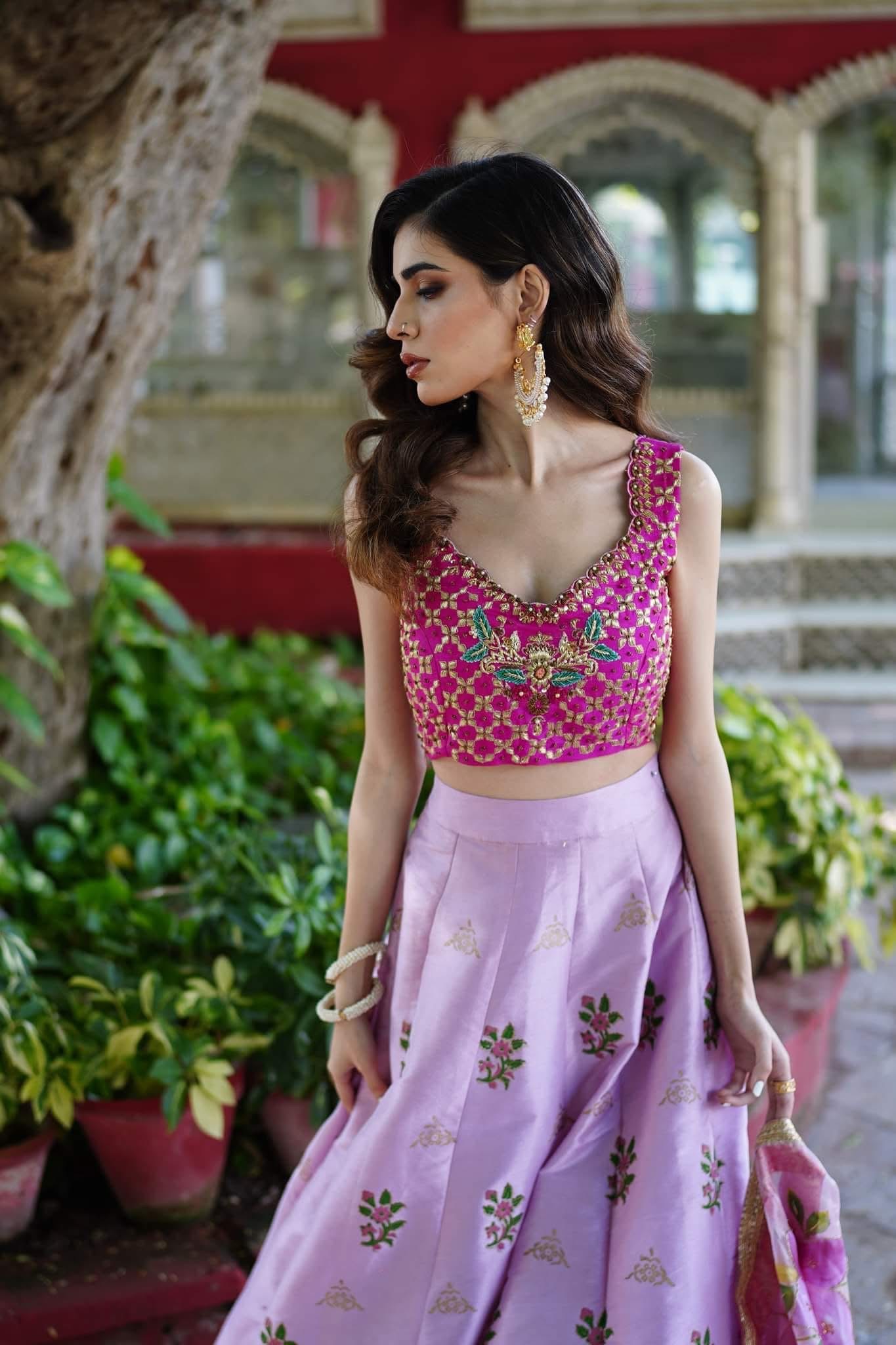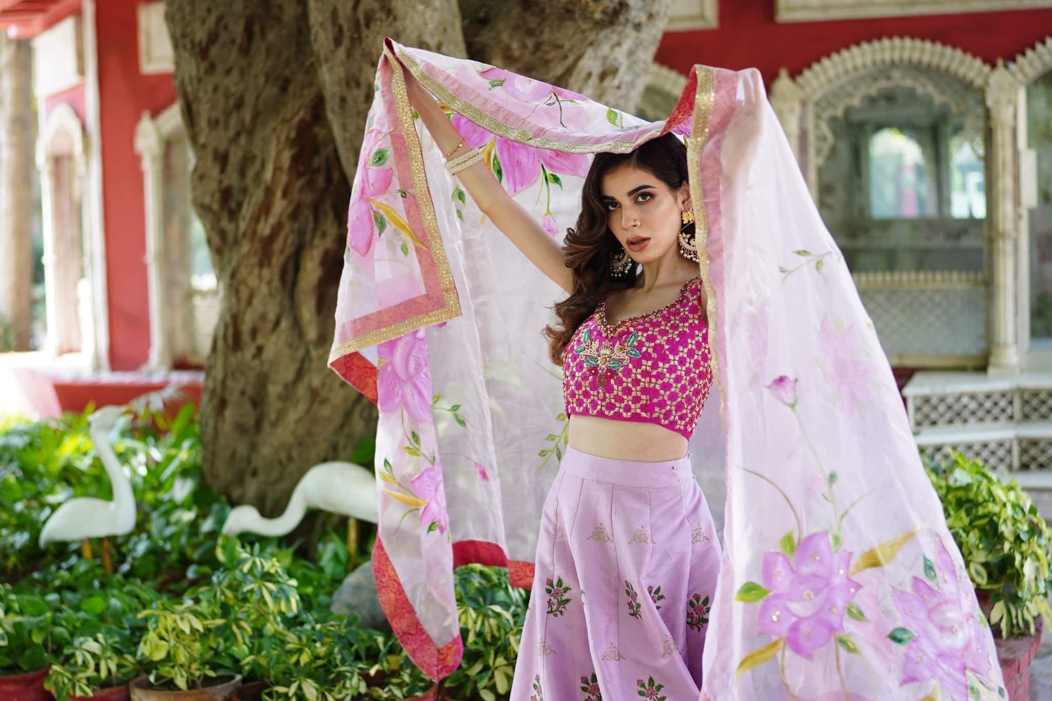 Embrace playful color and sophisticated craftsmanship with this exquisite ensemble. The set features a Lehnga and Choli made from luxurious pure Indian silk, providing a stunning structure and soft sheen. The Lehnga is detailed with charming hand block prints, while the Choli is a vibrant statement, fully covered in intricate handwork. It is completed with a light, airy organza dupatta that features delicate hand-painted and embellished detailing.