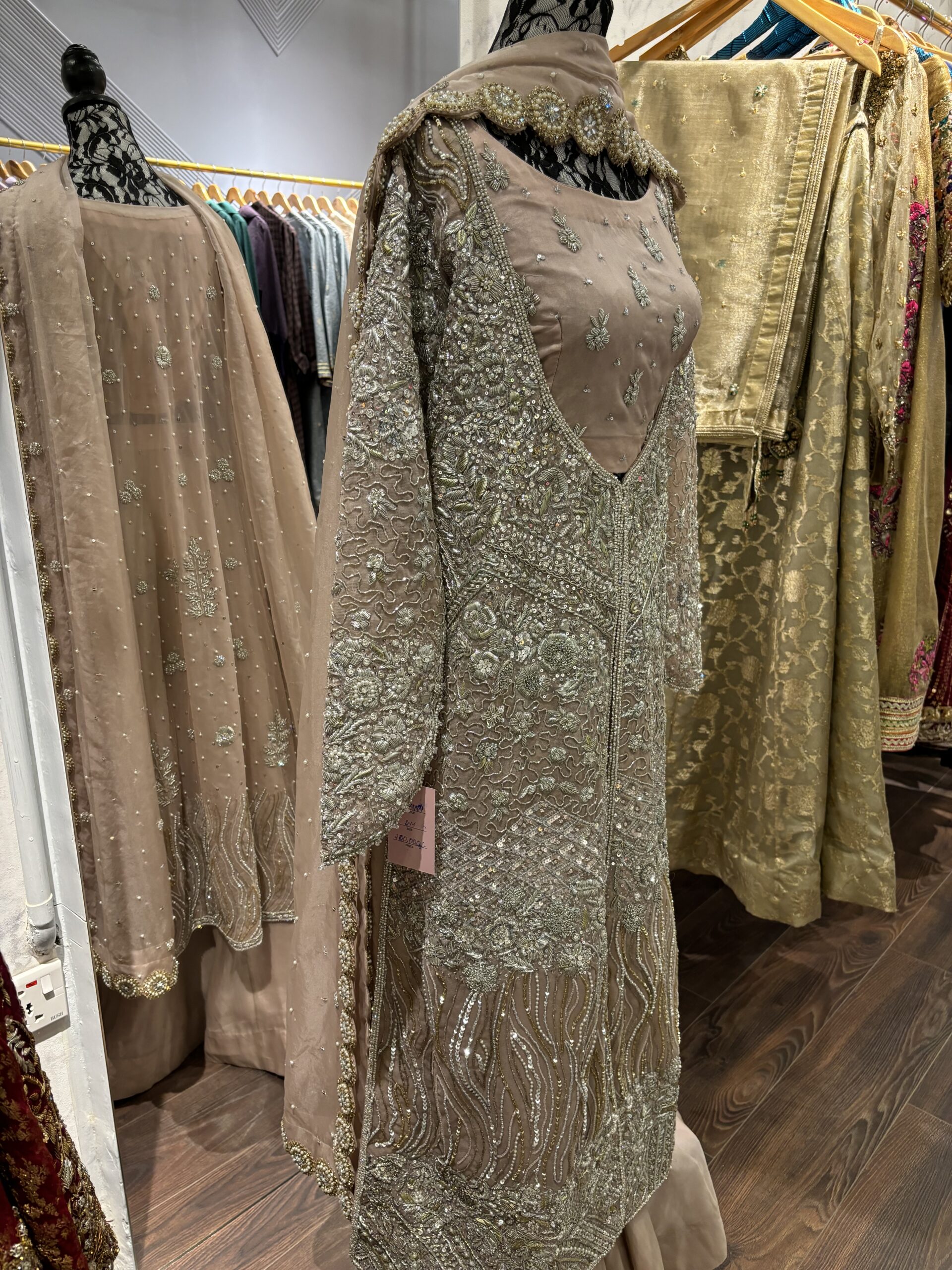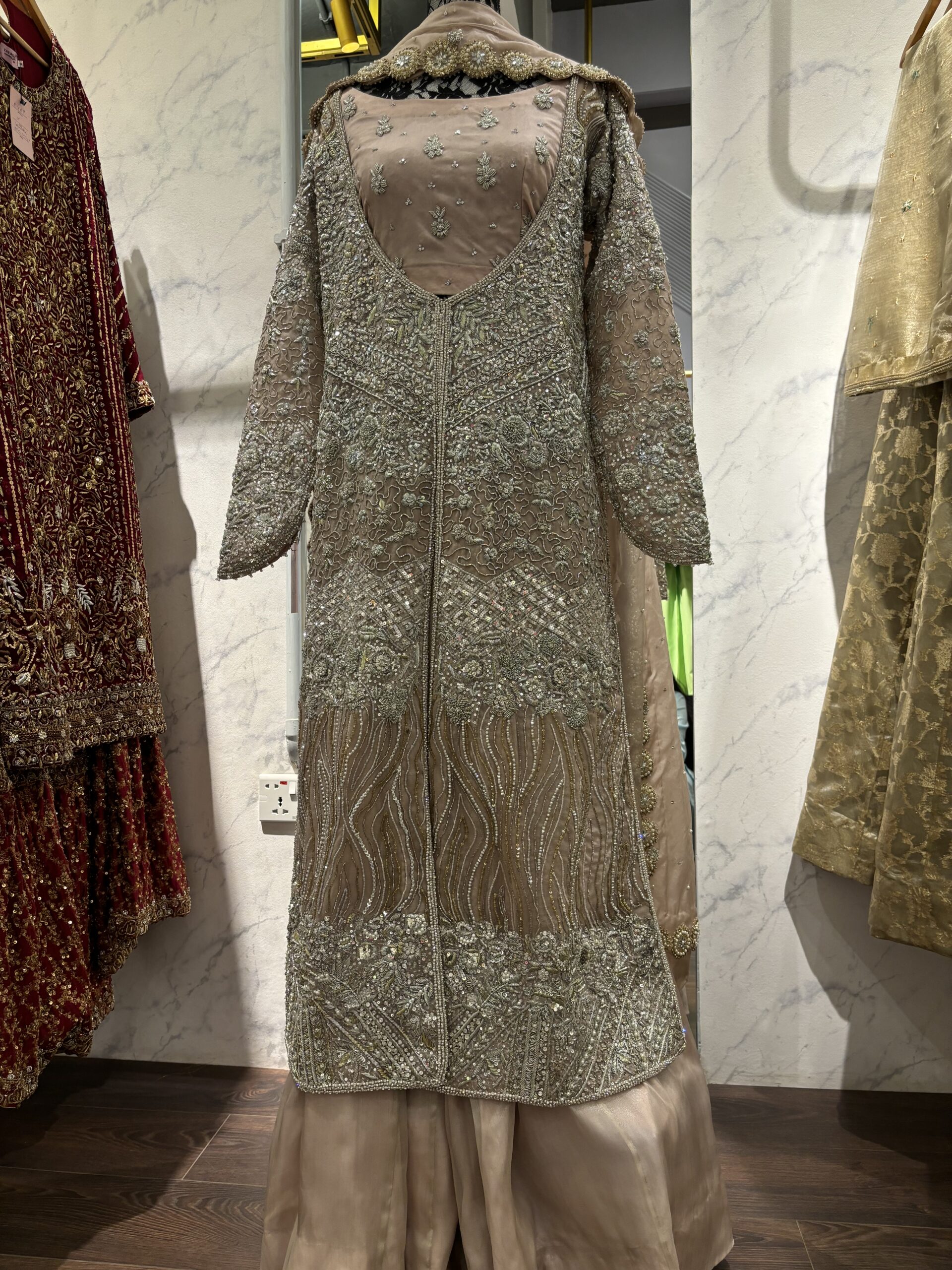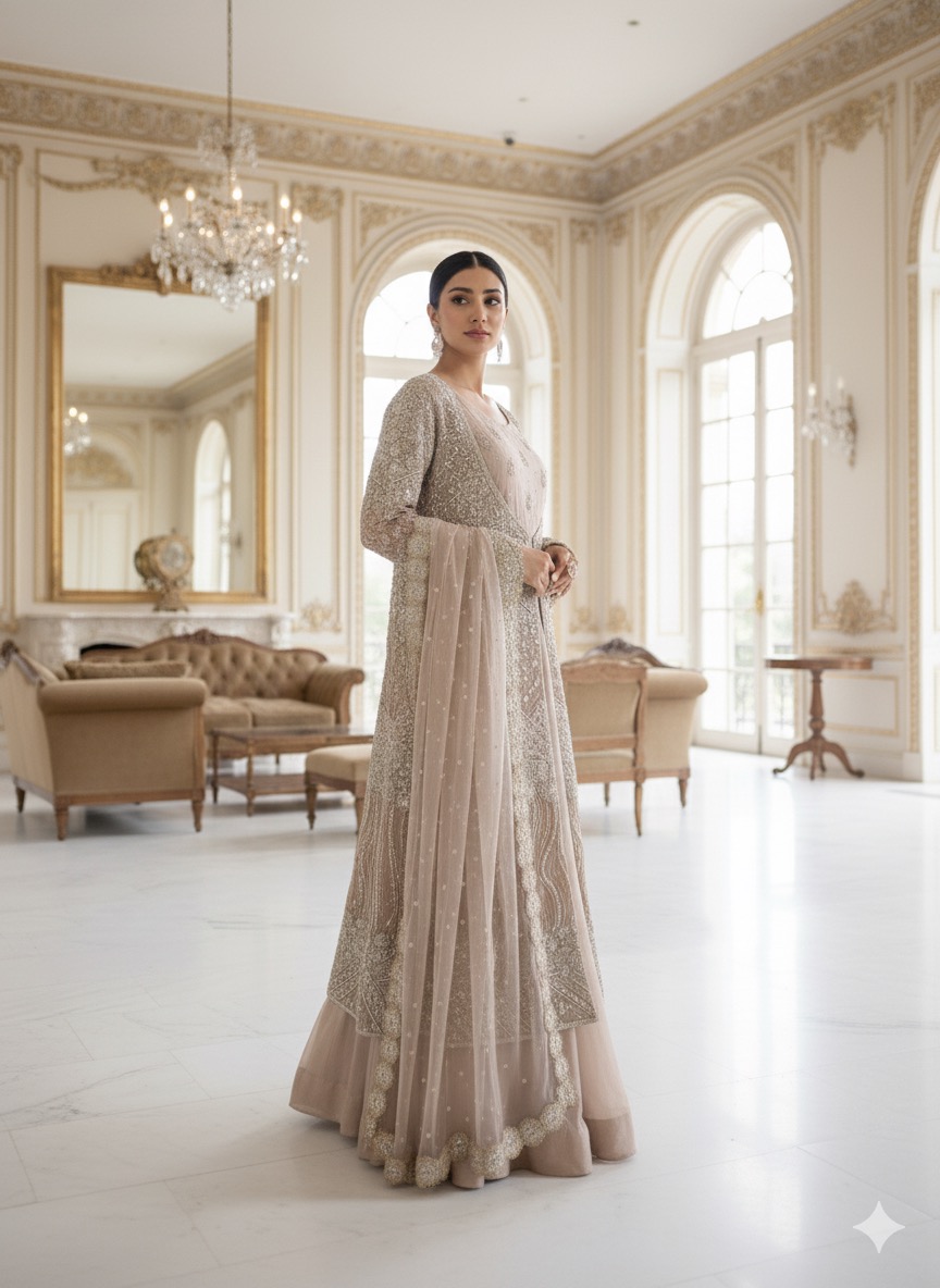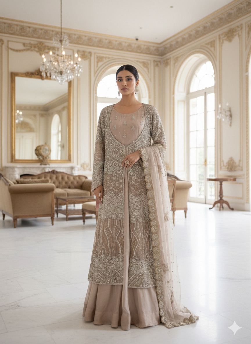 Step into sophistication with the Fem Fawn Jacket Ensemble, a stunning three-piece creation that perfectly balances traditional handwork with modern, flowing silhouettes. This outfit is designed to catch the light and command attention at any event.