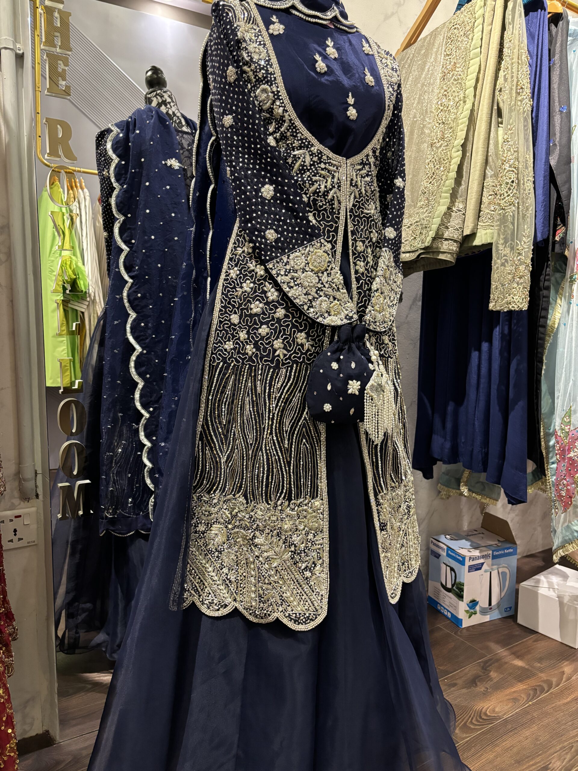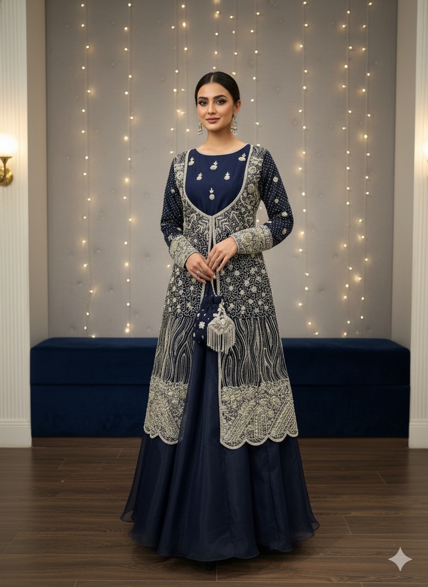 • Intricate Handwork: All four pieces are meticulously hand-embellished with dazzling silver zardozi, sparkling Swarovski crystals, and delicate pearls, creating an unforgettable shimmer and texture.