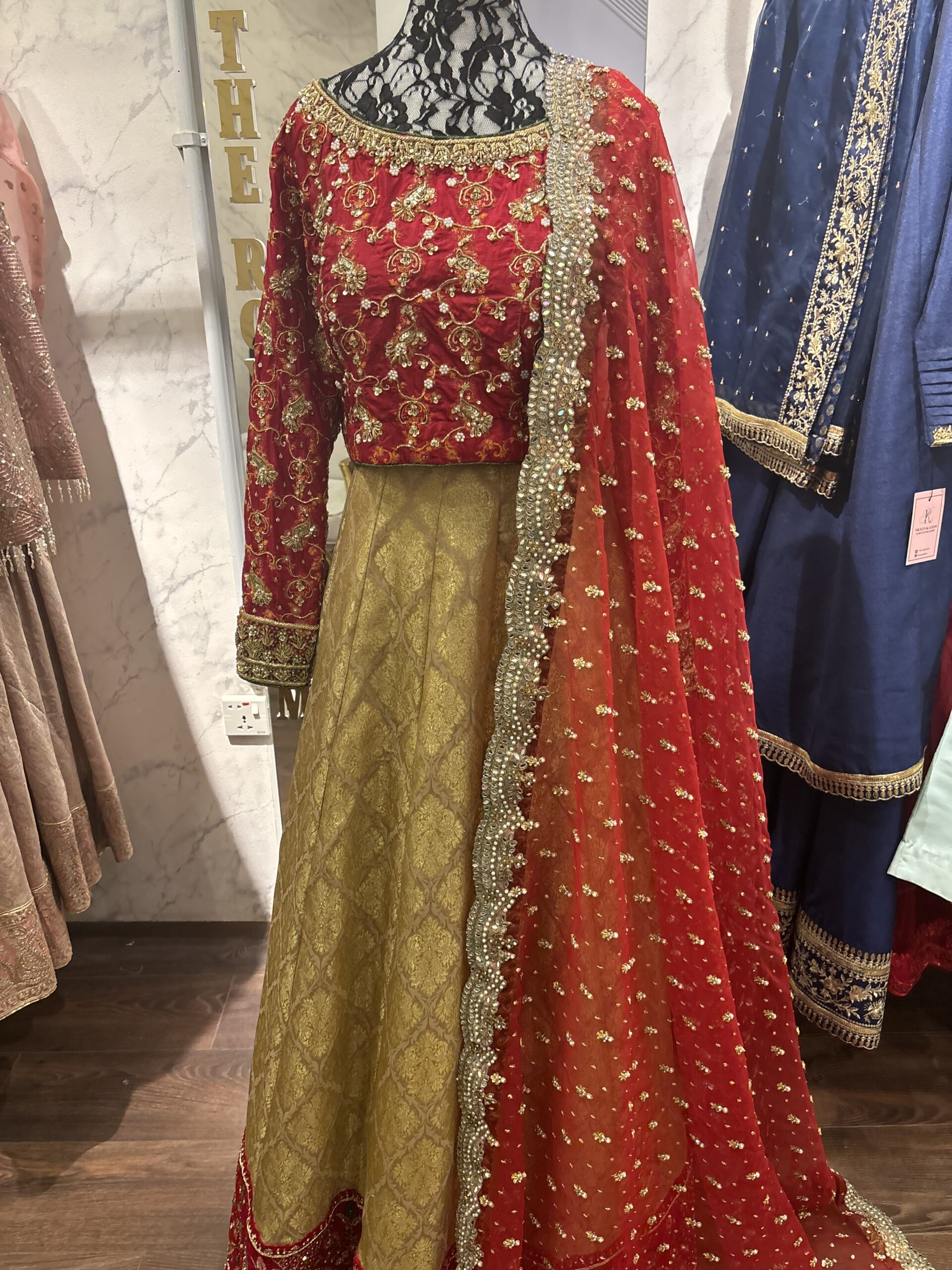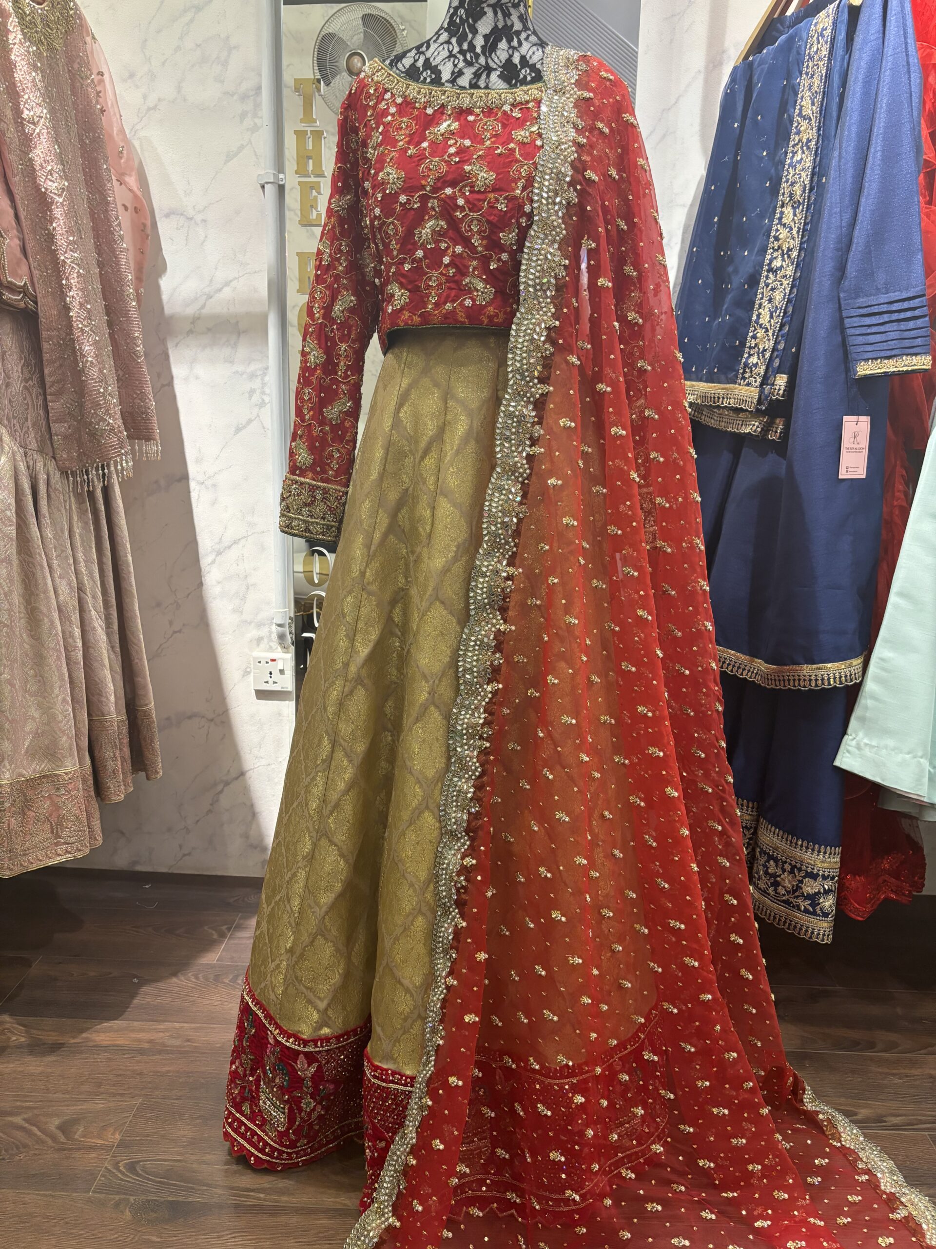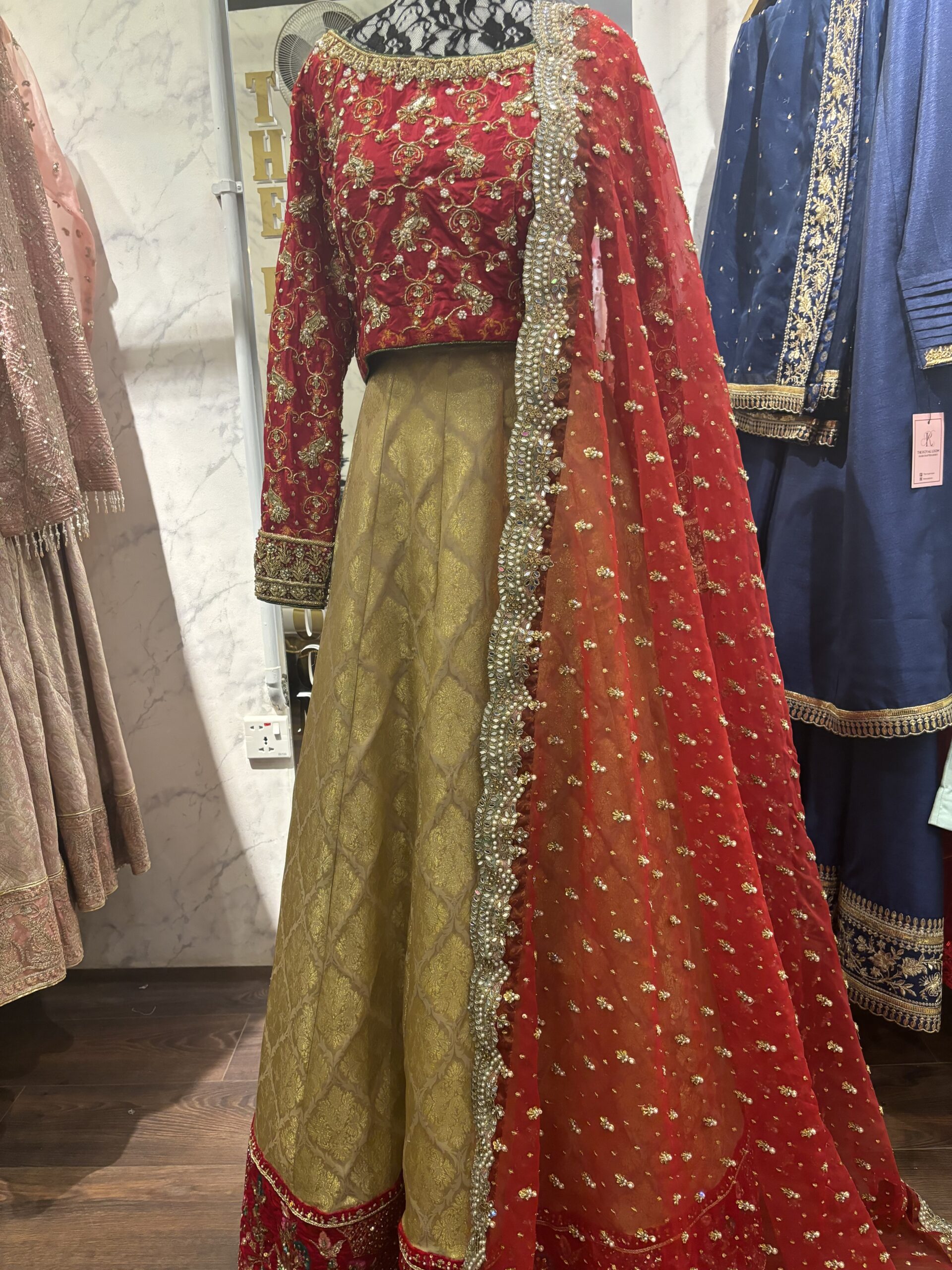 • Pure Organza Dupatta: A delicate dupatta in pure organza provides a soft, ethereal contrast. Its lightweight, sheer quality allows the heavy work of the lehenga and blouse to shine through, while completing the look with graceful flow.