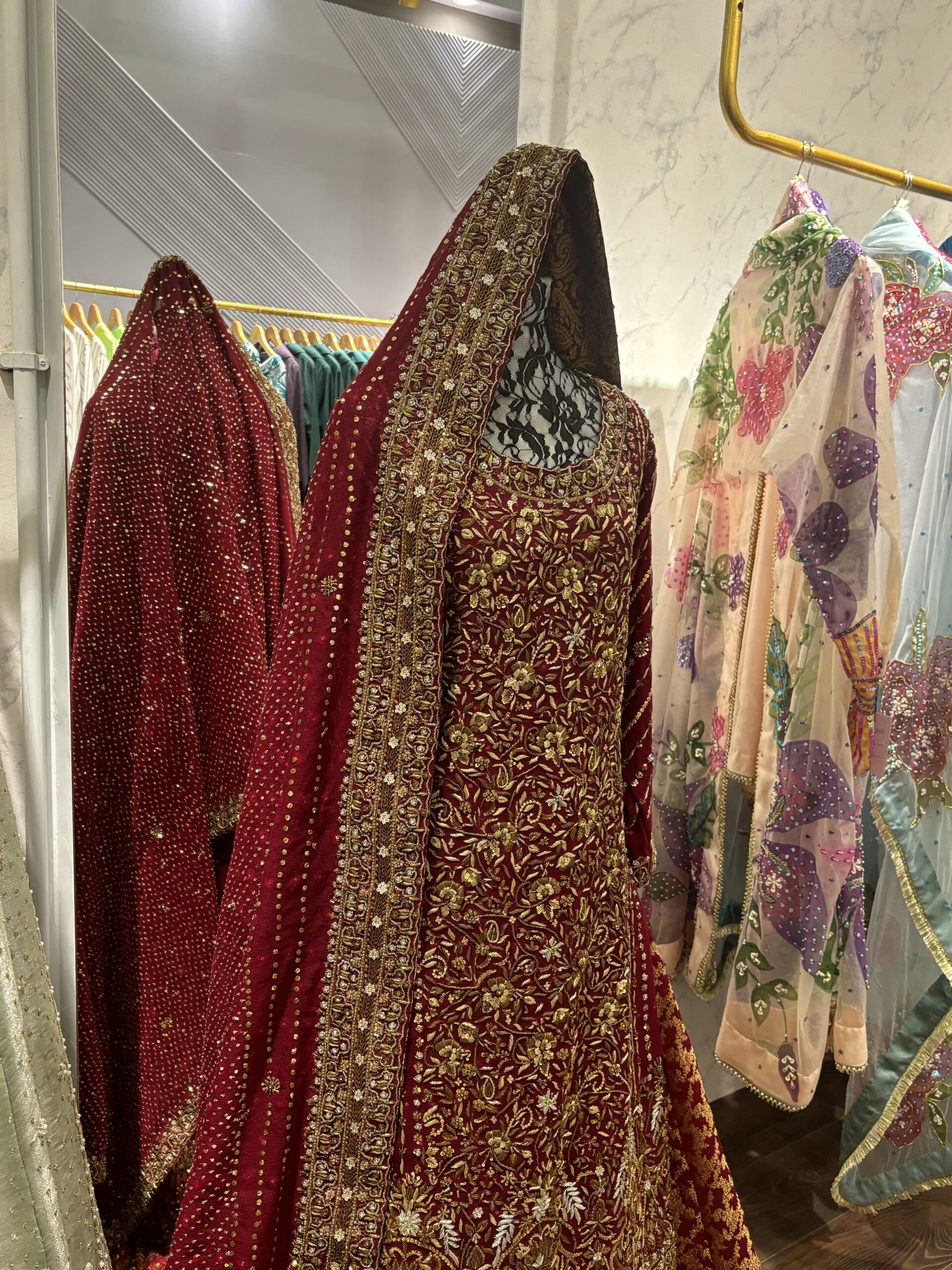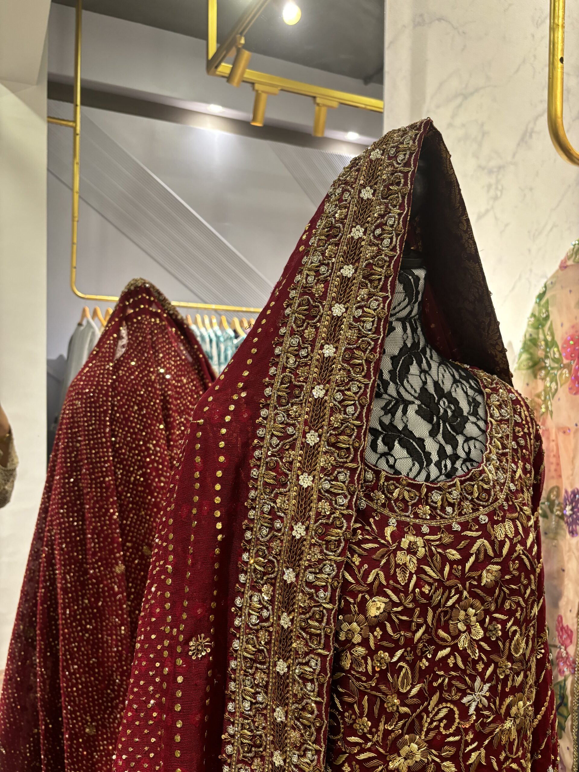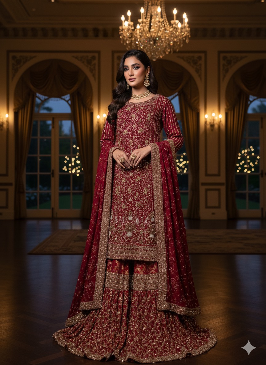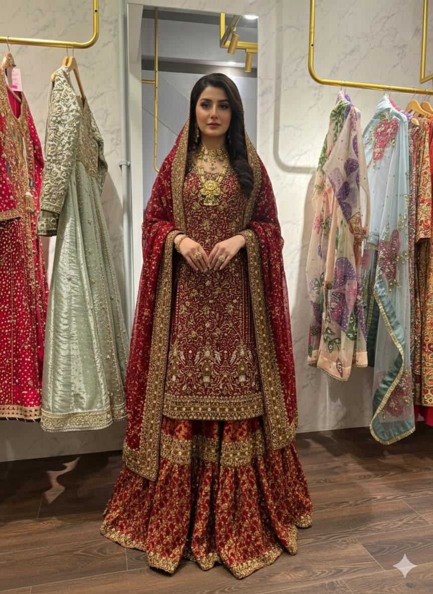 Completing this grand bridal attire is a matching Pure Khaddi Net Dupatta, also meticulously embellished with handwork. It drapes elegantly, framing the face and adding a final touch of regal sophistication. The Ruby Bridal is more than an outfit; it’s a heirloom in the making, promising a captivating and unforgettable presence.