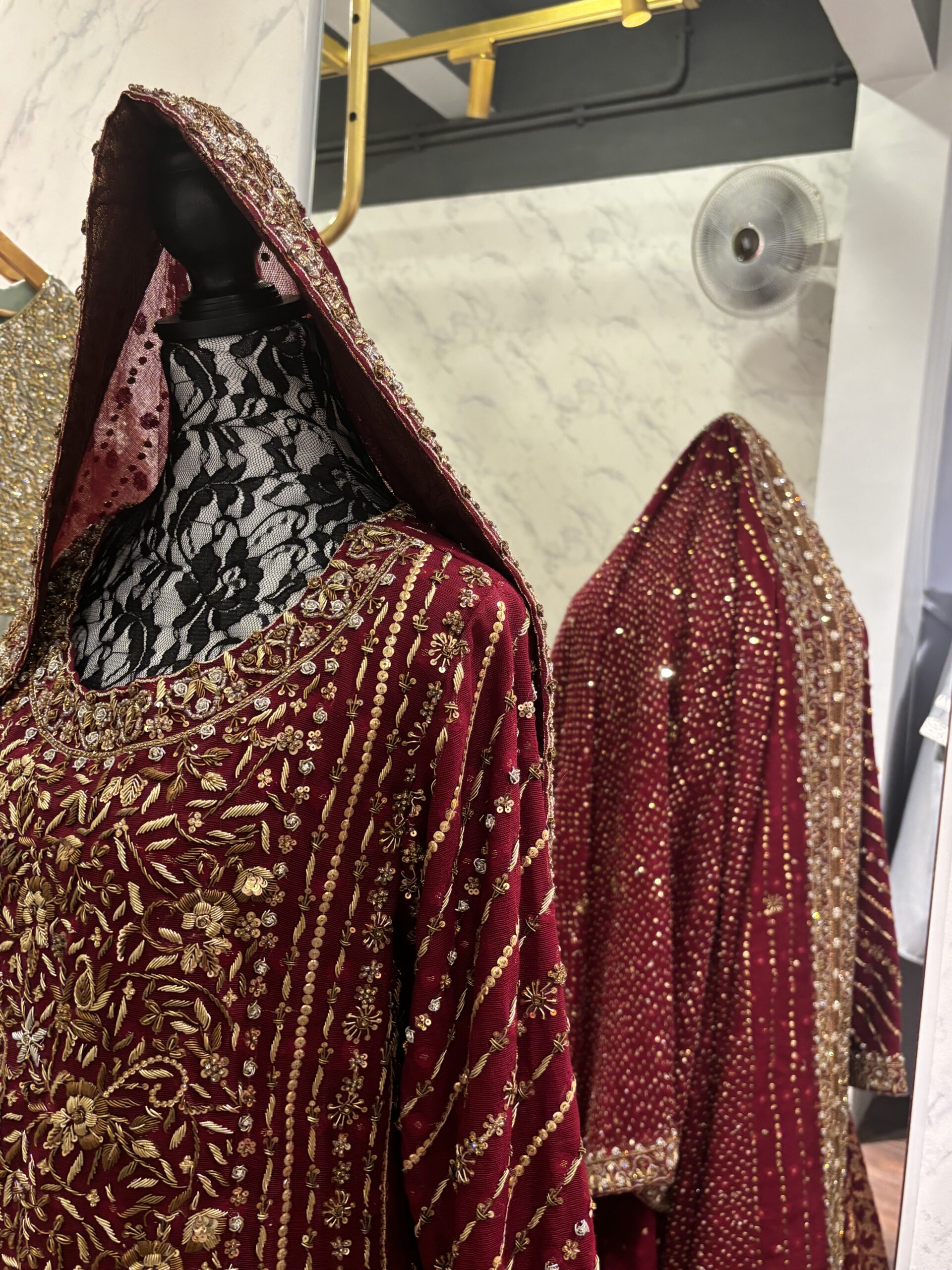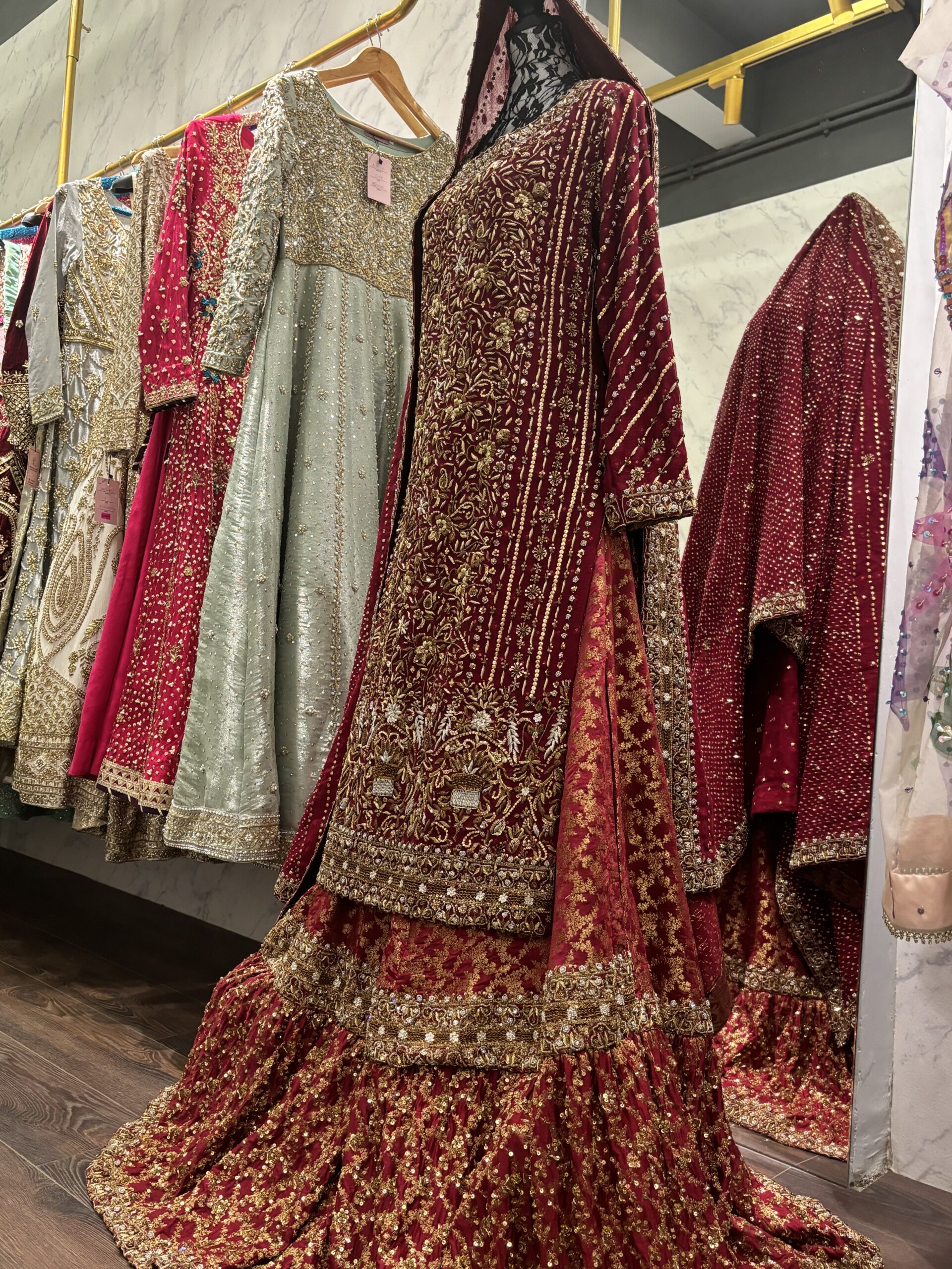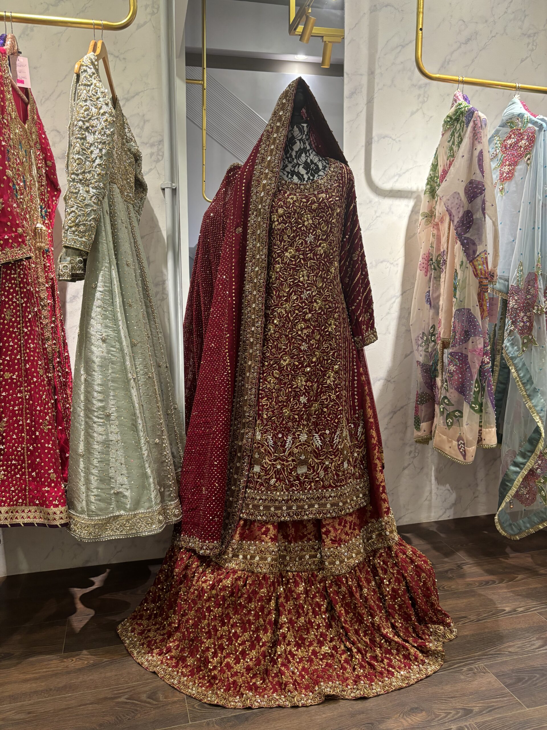 Presenting the breathtaking Ruby Bridal, a masterpiece of traditional craftsmanship and opulent design, destined to make every bride’s momentous day unforgettable. This resplendent ensemble is entirely crafted with meticulous handwork, showcasing unparalleled artistry and dedication.