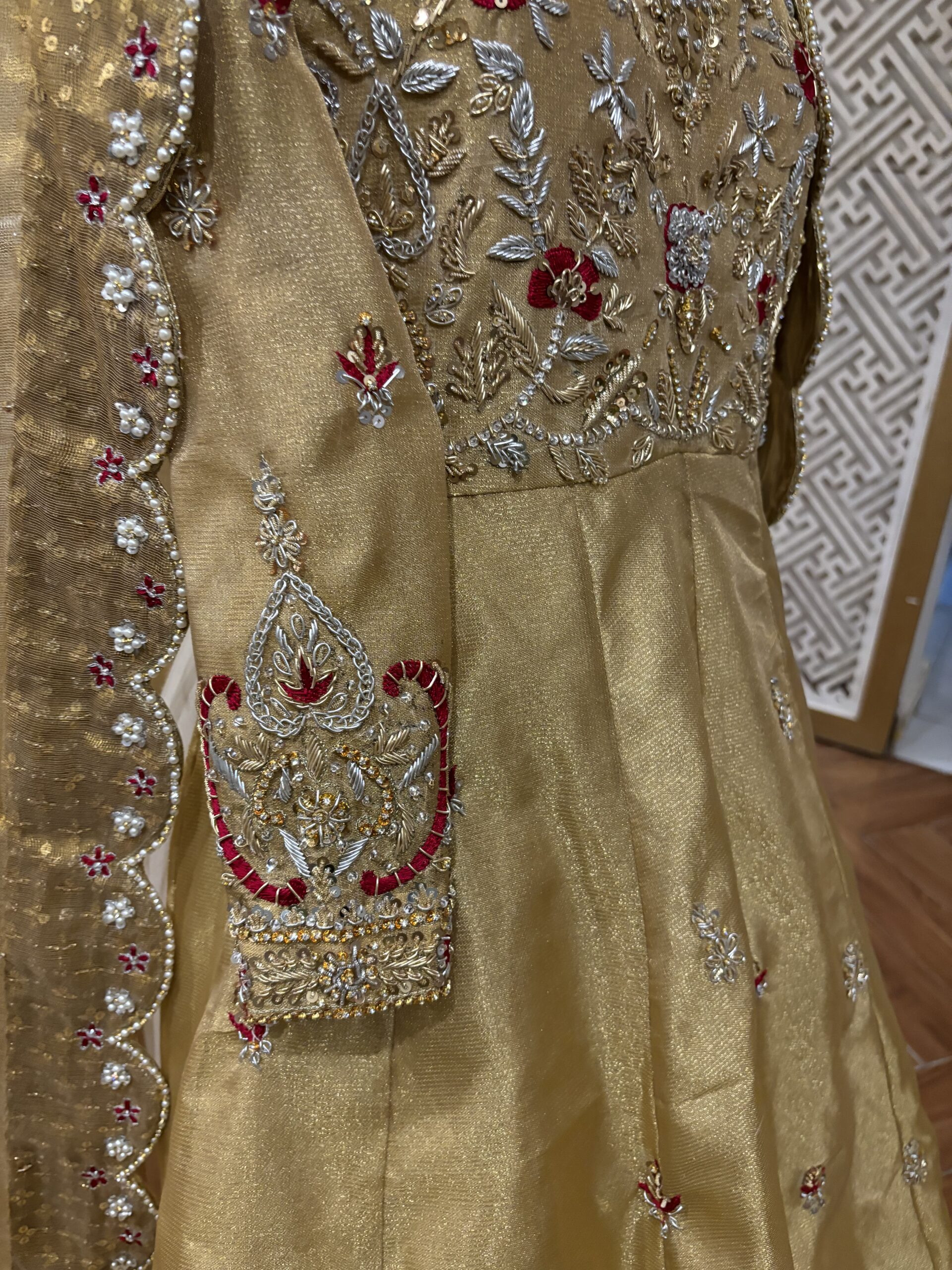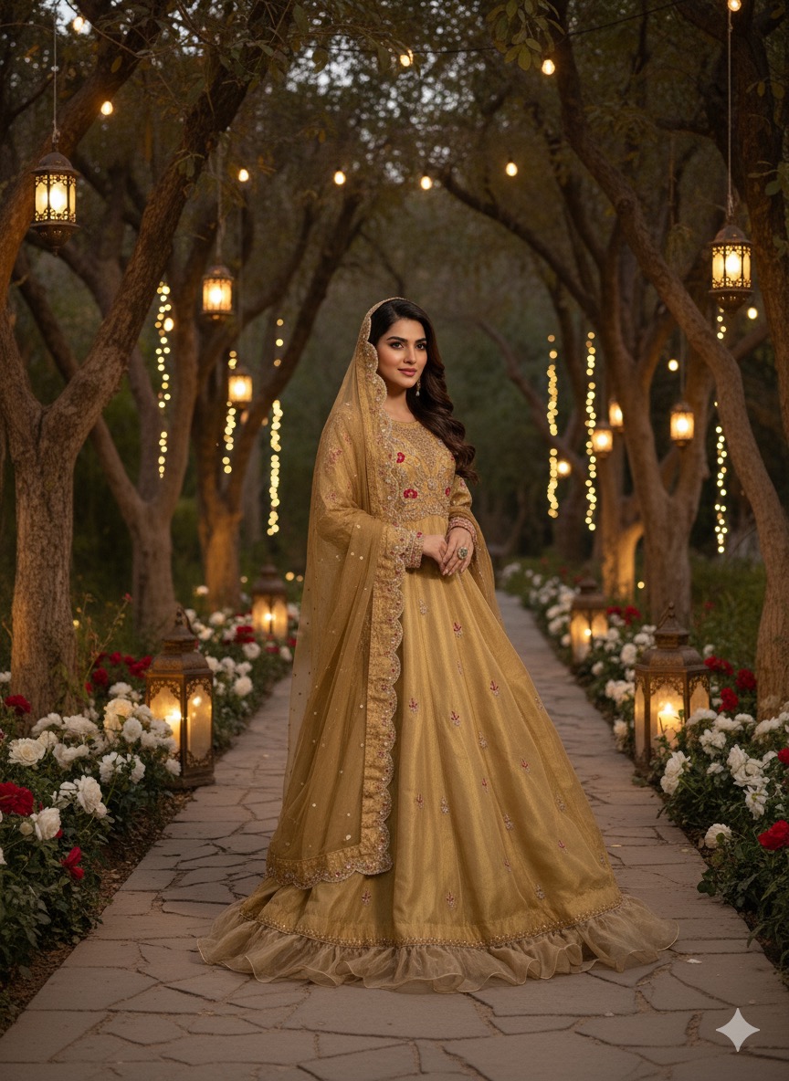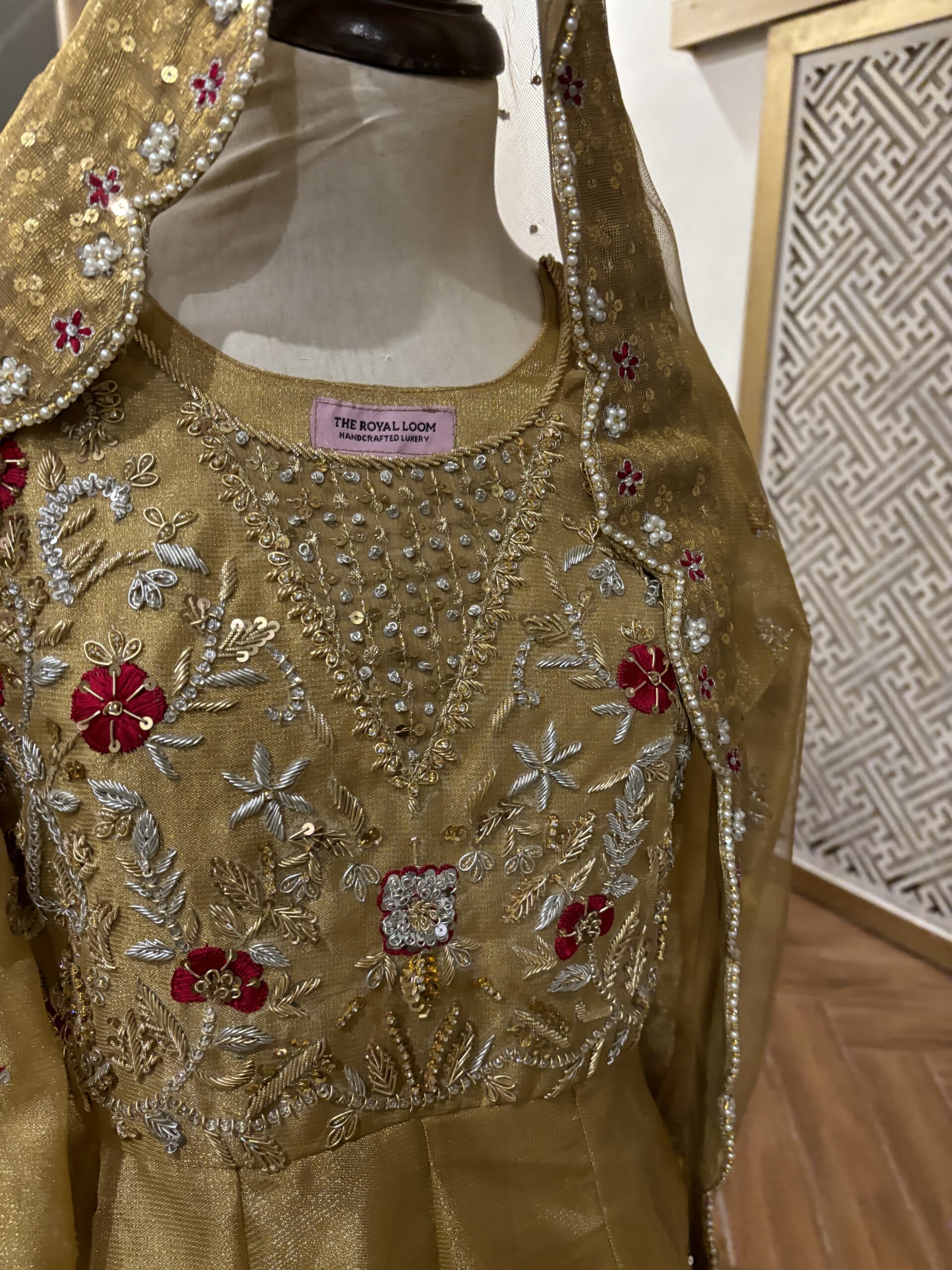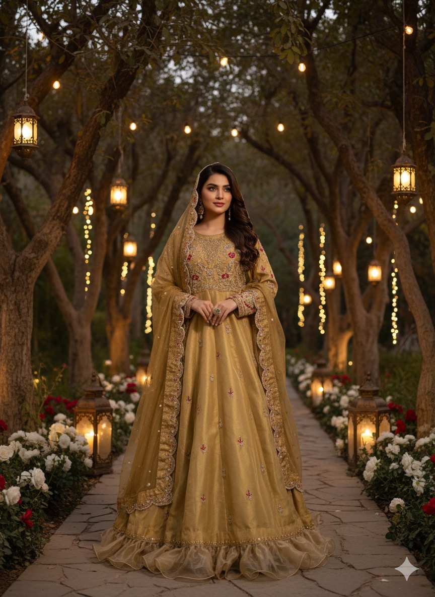 Step into a world of majestic elegance with the Sunehri Kalidaar Ensemble, a breathtaking outfit designed for unforgettable occasions.