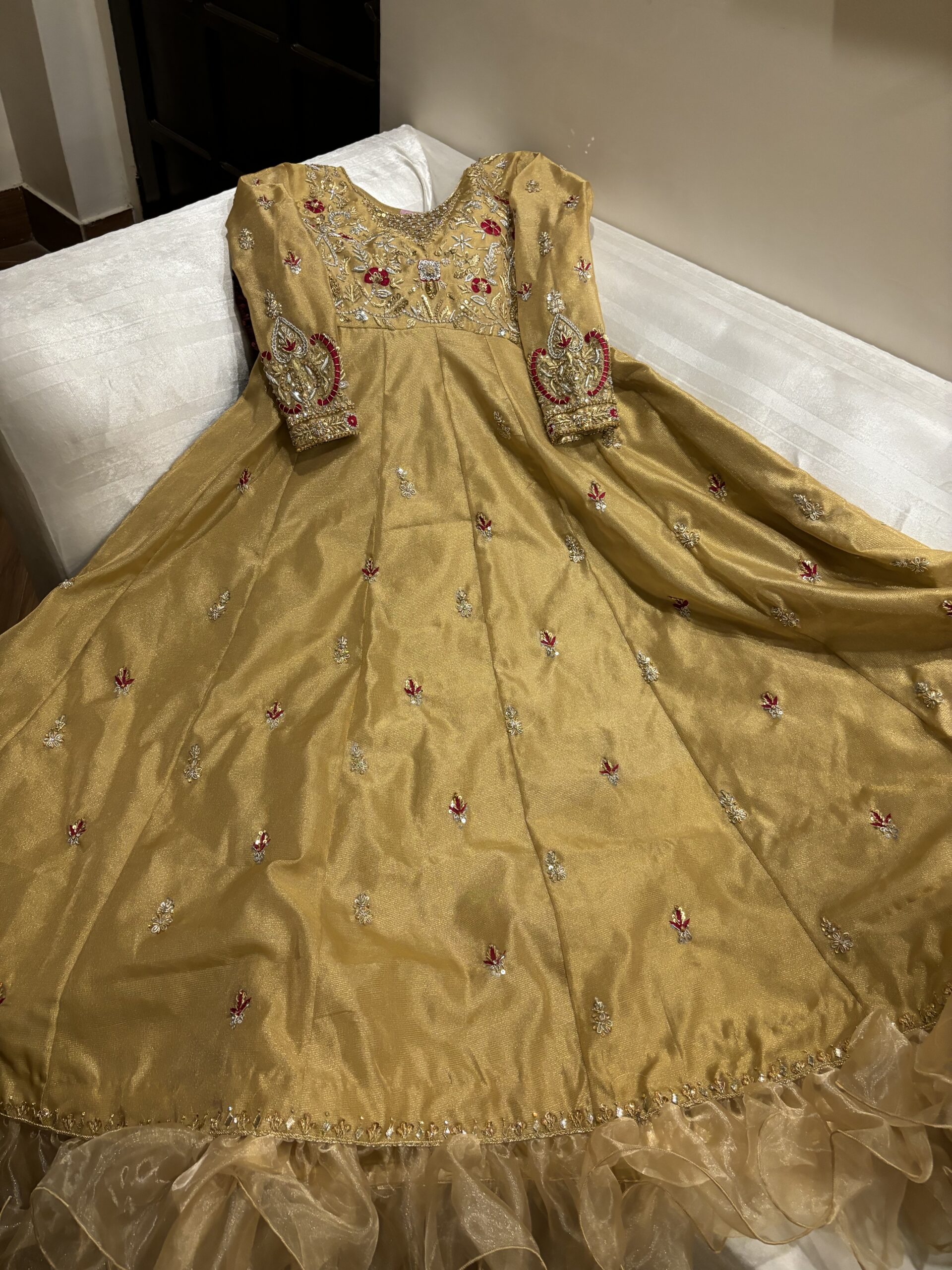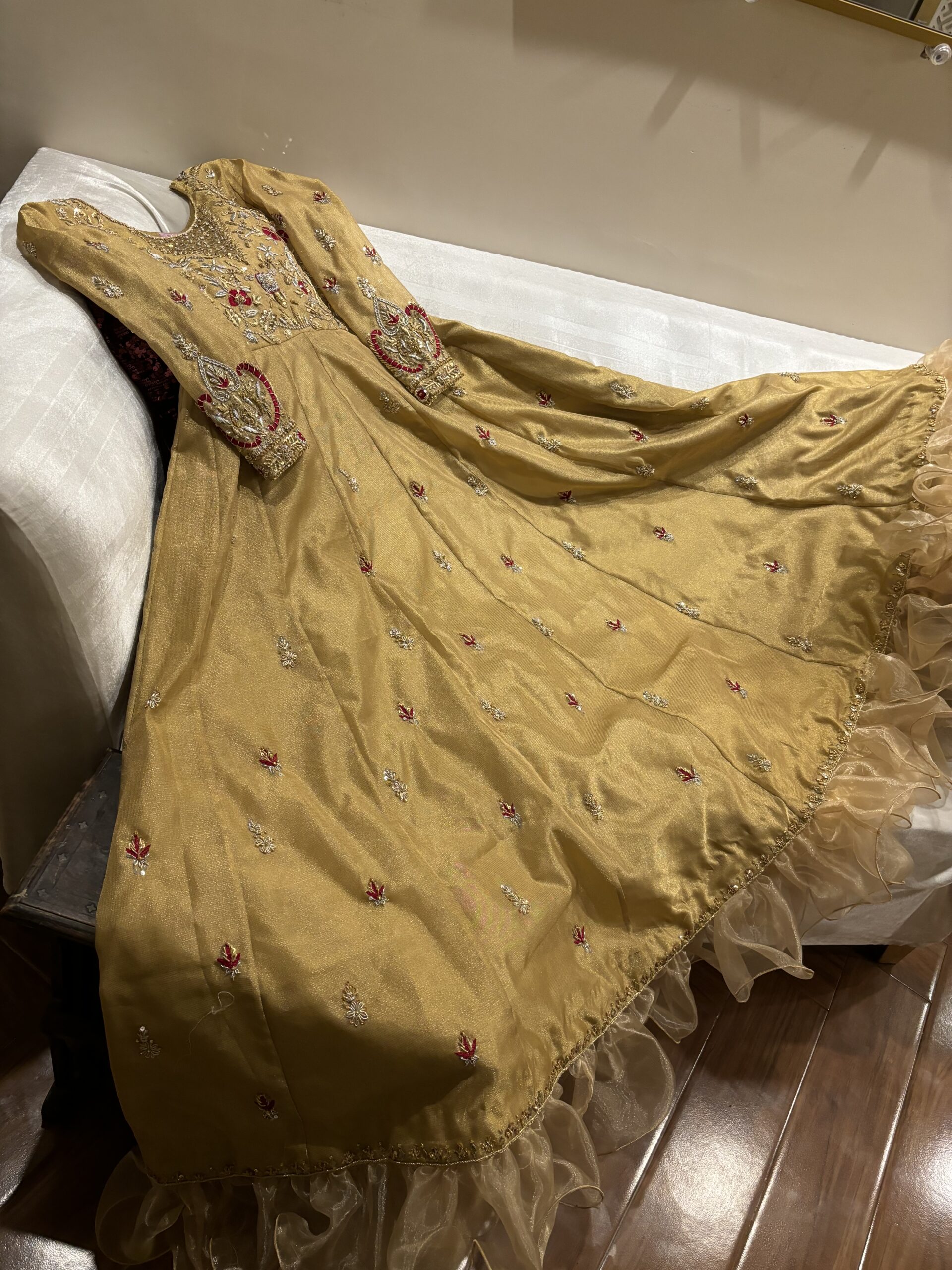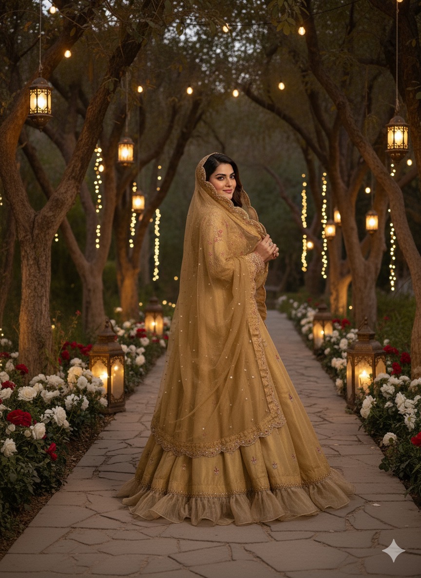 Step into a world of majestic elegance with the Sunehri Kalidaar Ensemble, a breathtaking outfit designed for unforgettable occasions.