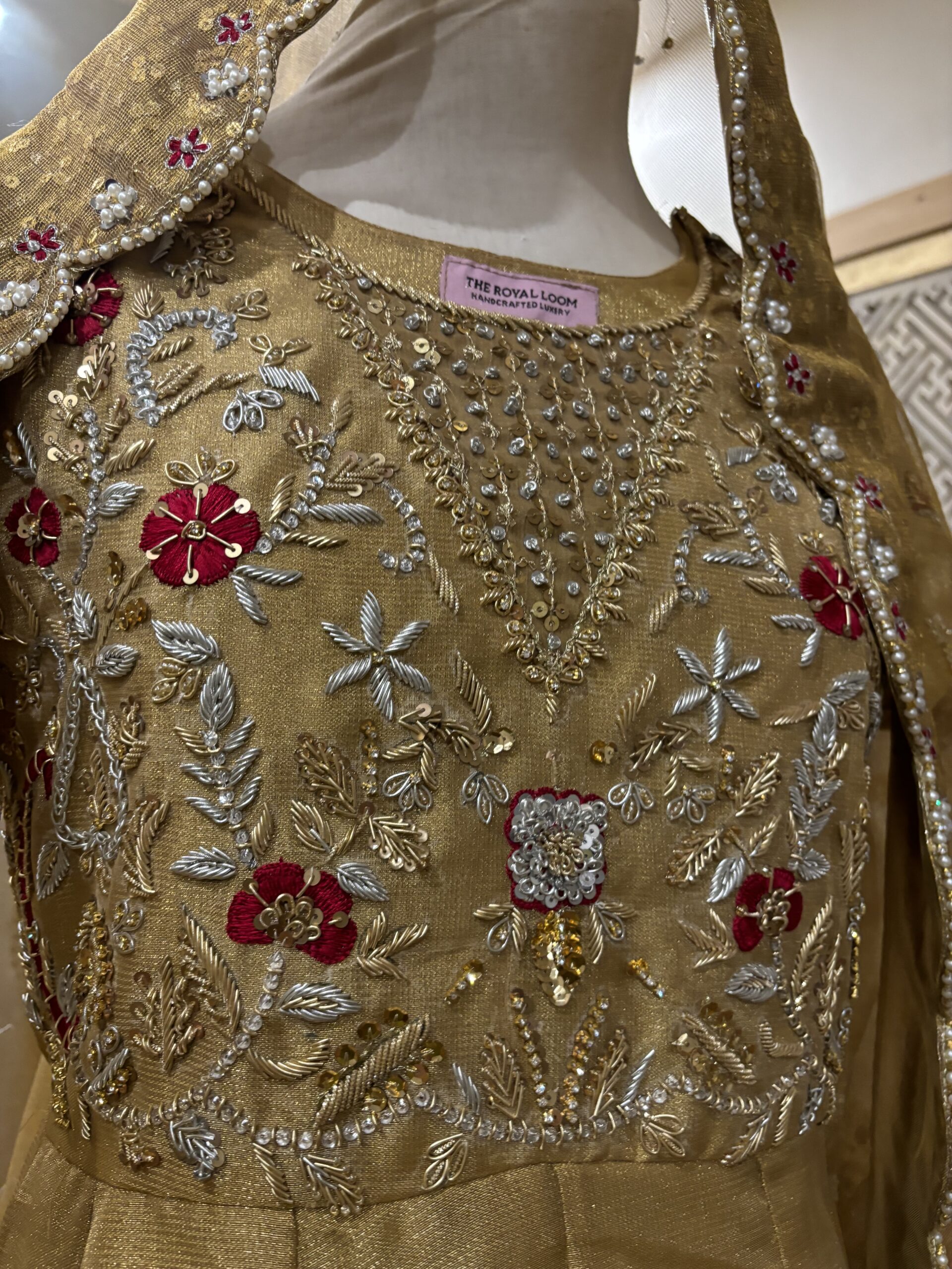 • Luxurious Fabric: The floor-length Kalidaar is crafted from exquisite Lama Tissue, known for its rich texture and subtle sheen, draping you in pure golden luxury.