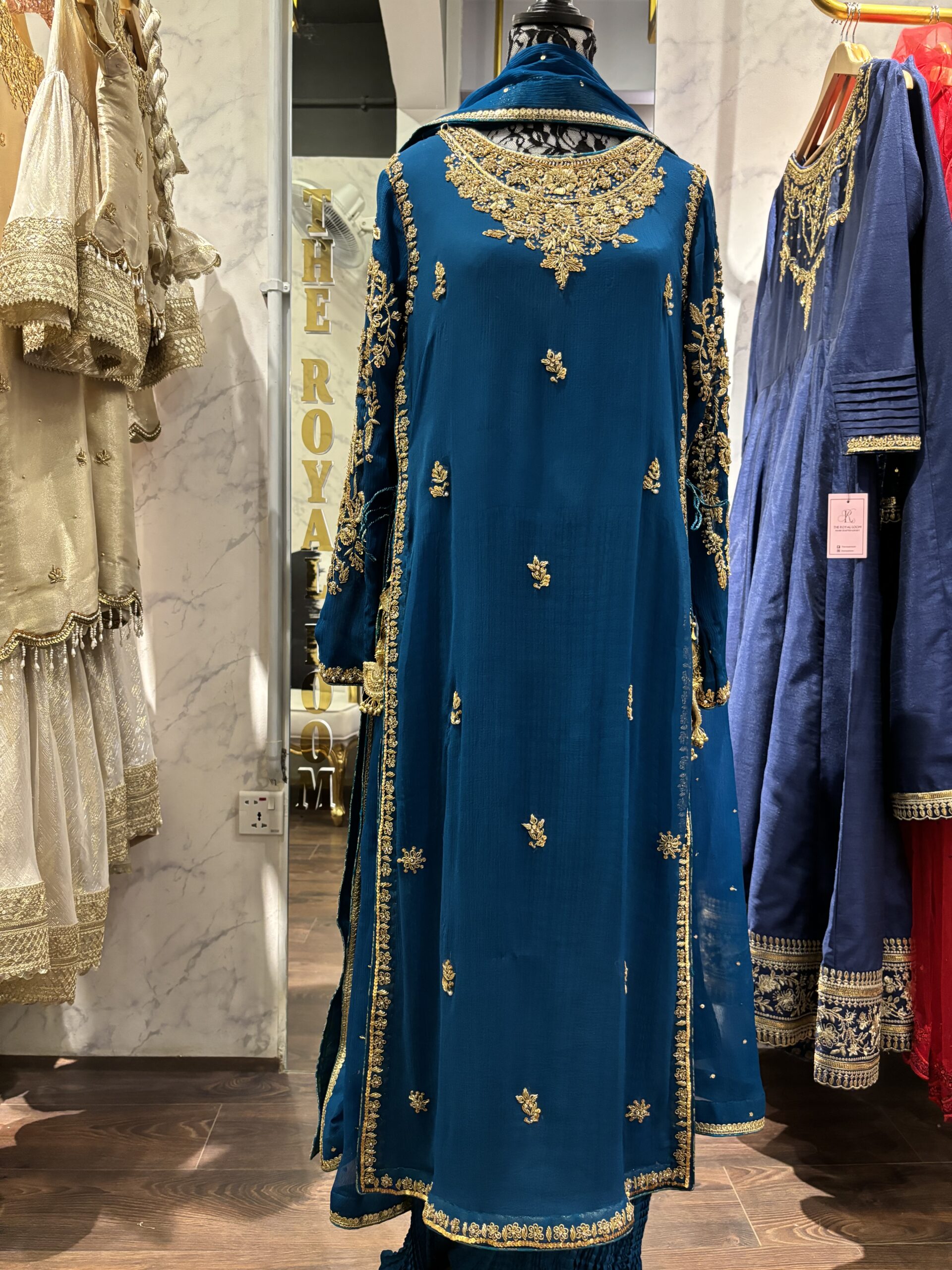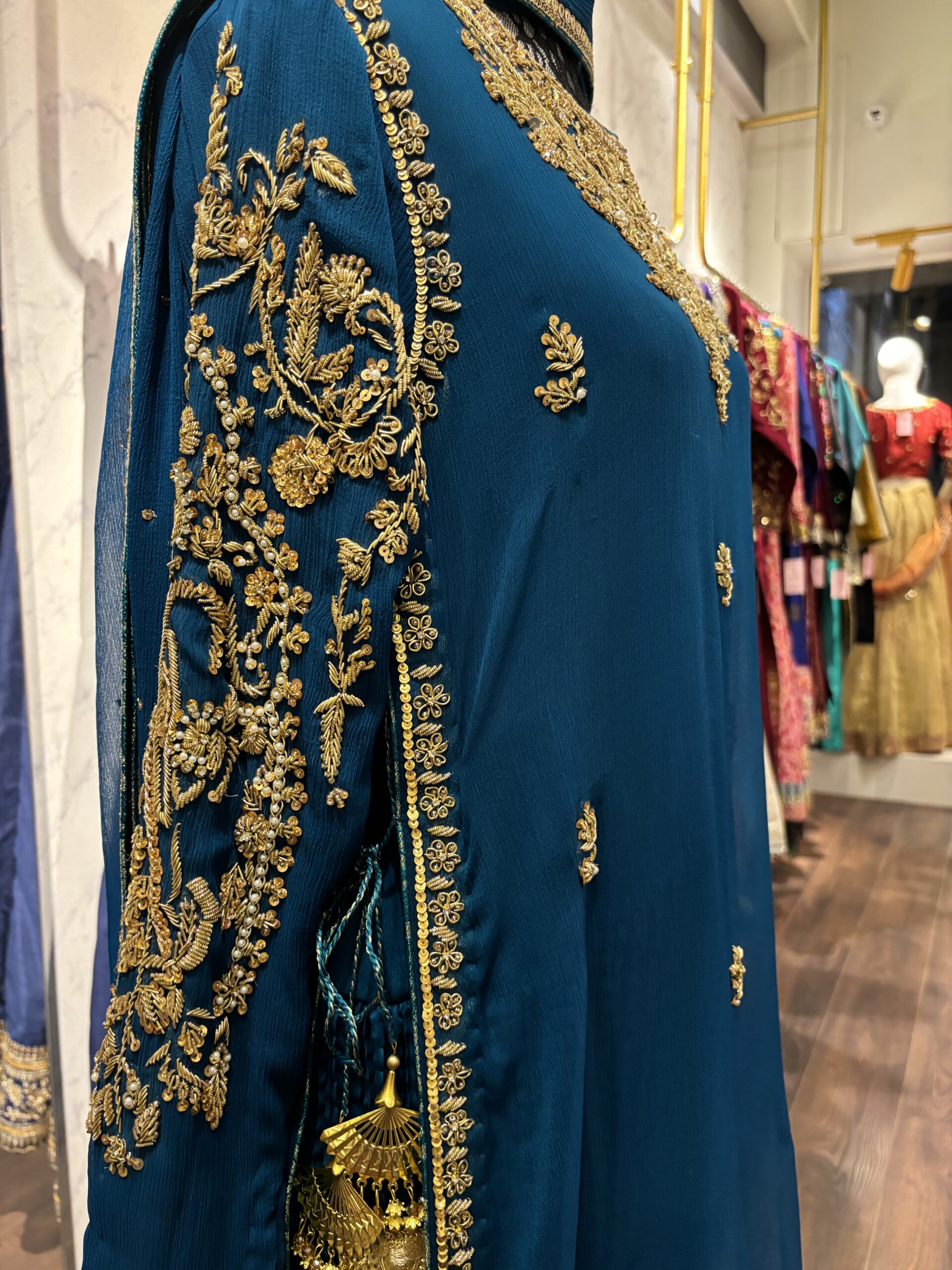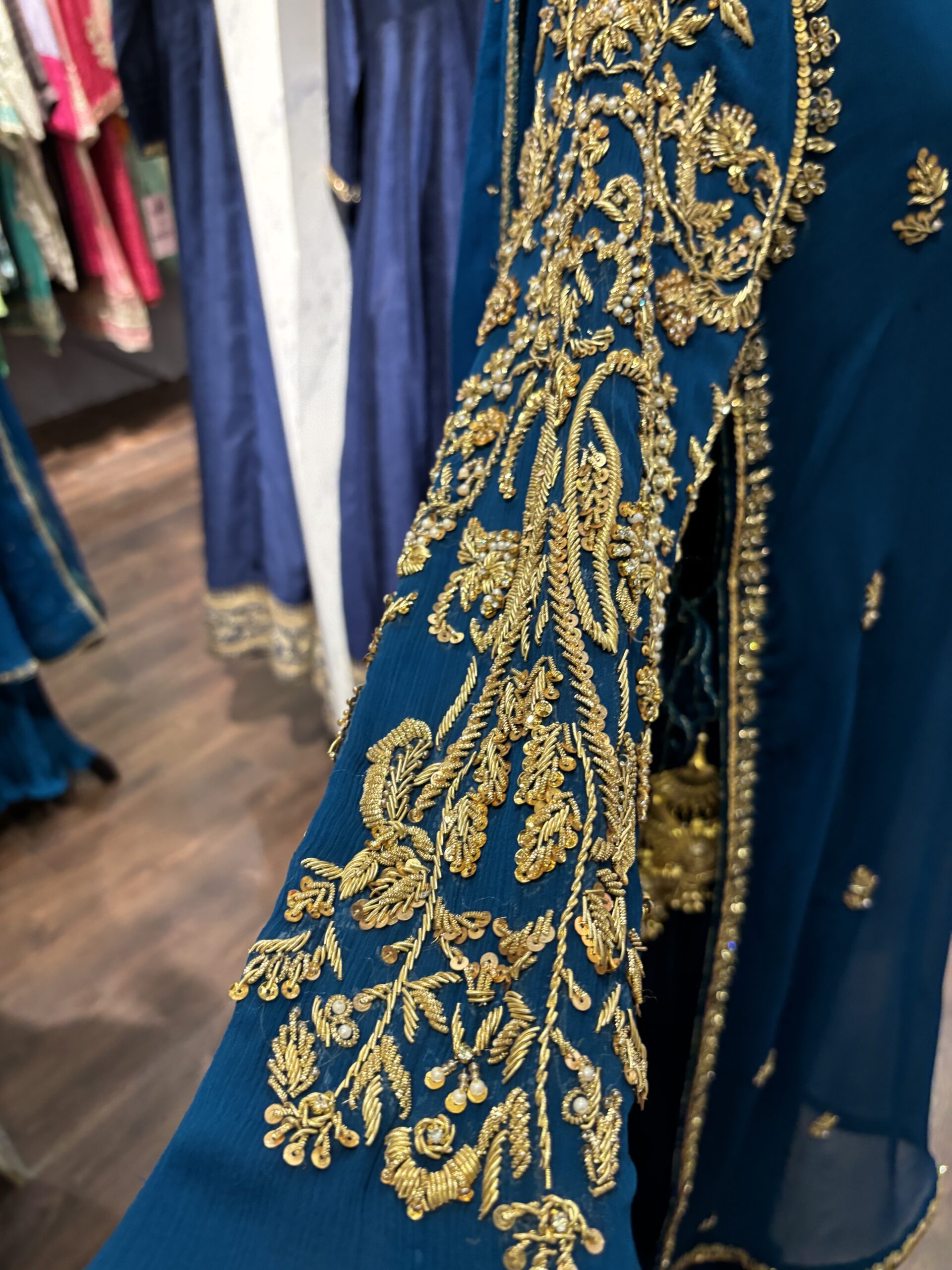 > Experience the ultimate in formal luxury with the captivating Teal Fantasy, an opulent, entirely hand-embellished ensemble crafted for the discerning wearer. This outfit is a symphony of rich textures and magnificent craftsmanship.