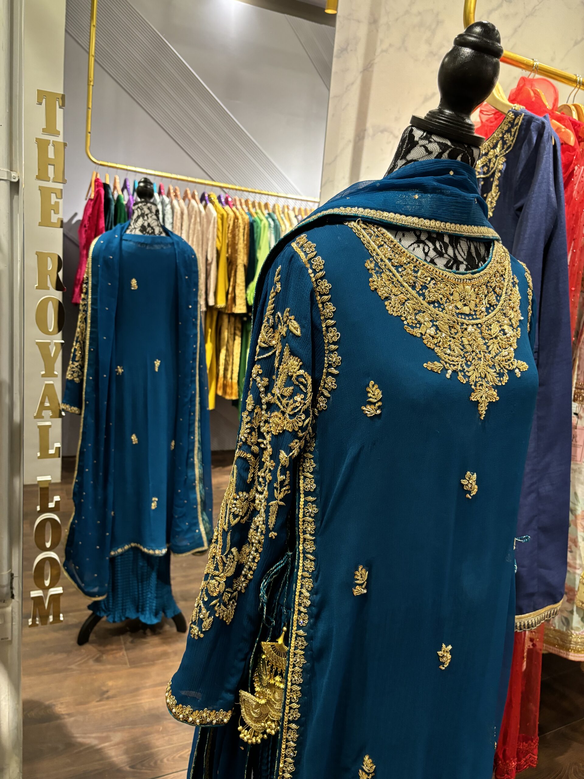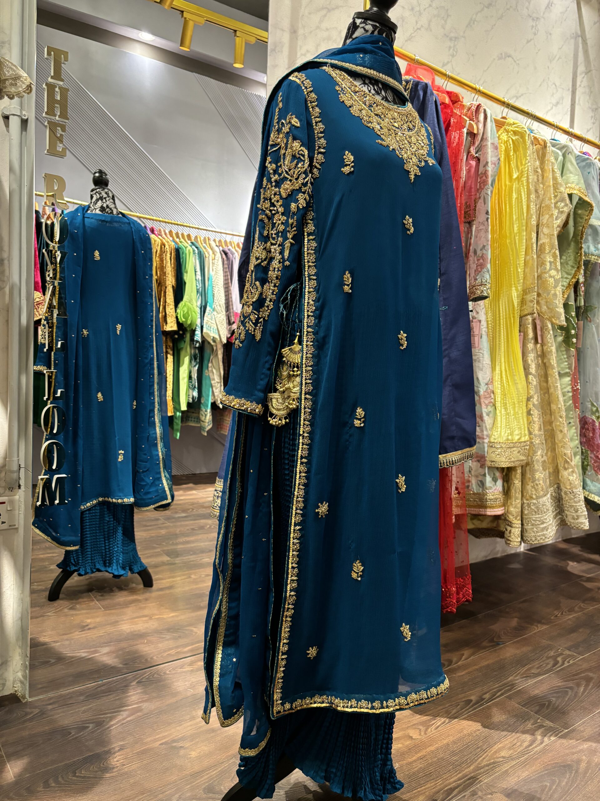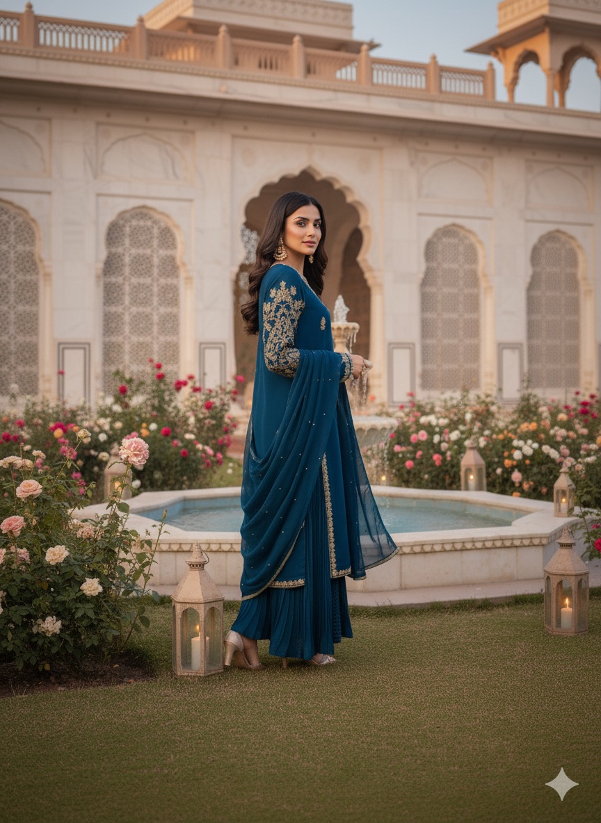 > Experience the ultimate in formal luxury with the captivating Teal Fantasy, an opulent, entirely hand-embellished ensemble crafted for the discerning wearer. This outfit is a symphony of rich textures and magnificent craftsmanship.
